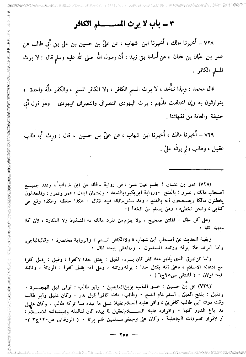 ٧٢٩ - أَخْبَرَنَا مَالِكٌ، عَنِ ابْنِ شِهَابٍ، عَنْ عَلِيِّ بْنِ حُسَيْنٍ، قَالَ: «وَرِثَ أَبَا طَالِبٍ عَقِيلٌ وَطَالِبٌ، وَلَمْ يَرِثْهُ عَلِيٌّ»