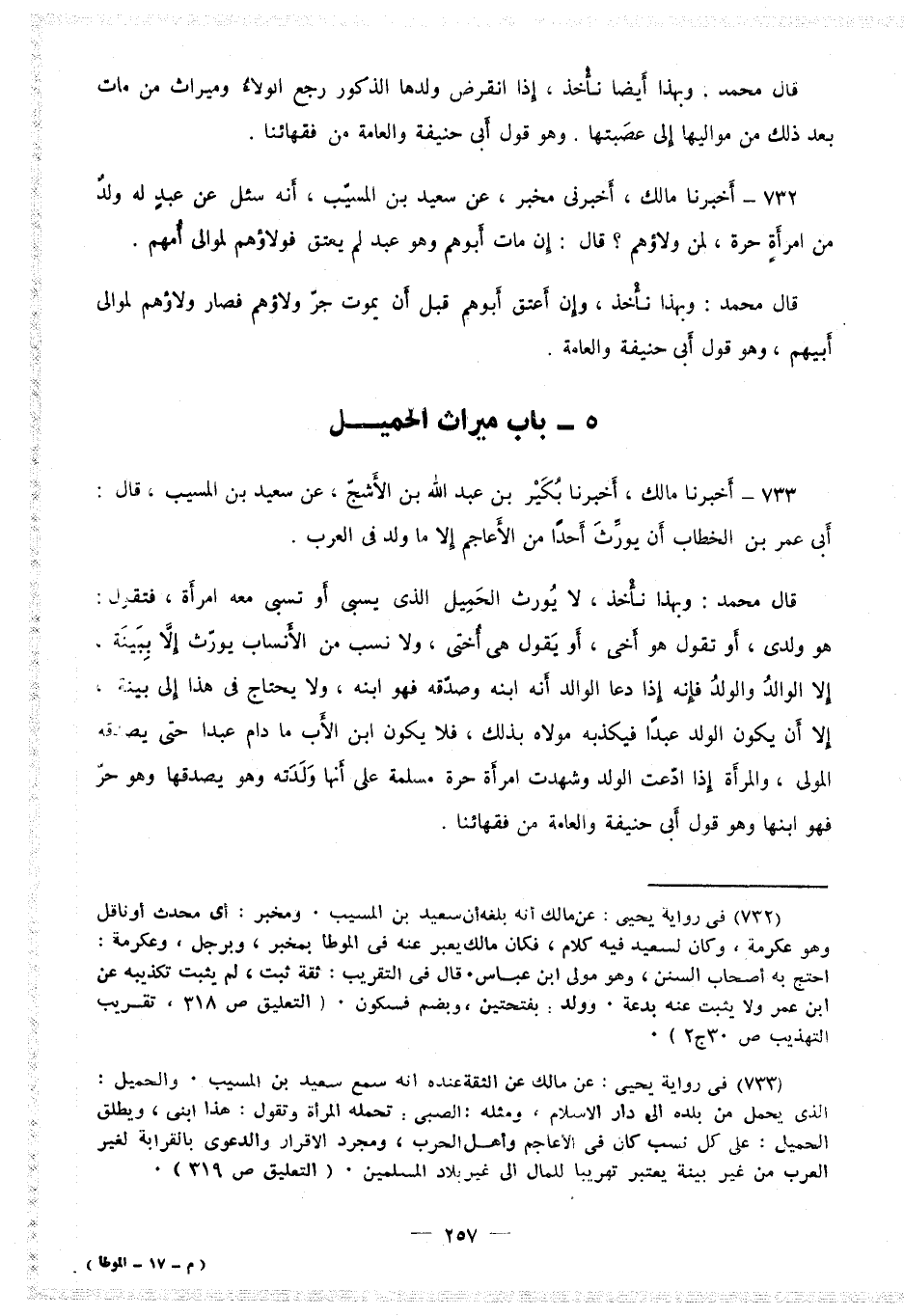 ٧٣٣ - أَخْبَرَنَا مَالِكٌ، أَخْبَرَنَا بُكَيْرُ بْنُ عَبْدِ اللَّهِ بْنِ الأَشَجِّ، عَنْ سَعِيدِ بْنِ الْمُسَيِّبِ، قَالَ: «أَبَى عُمَرُ بْنُ الْخَطَّابِ، أَنْ يُوَرِّثَ أَحَدًا مِنَ الأَعَاجِمِ إِلا مَا وُلِدَ فِي الْعَرَبِ» ، قَالَ مُحَمَّدٌ: وَبِهَذَا نَأْخُذُ، لا يُوَرَّثُ الْحَمِيلُ الَّذِي يُسْبَى وَتُسْبَى مَعَهُ امْرَأَةٌ، فَتَقُولُ: هُوَ وَلَدِي أَوْ تَقُولُ هُوَ أَخِي، أَوْ يَقُولُ هِيَ أُخْتِي، وَلا نَسَبَ مِنَ الأَنْسَابِ يُوَرِّثُ إِلَّا بِبَيِّنَةٍ إِلَّا الْوَالِدُ وَالْوَلَدُ، فَإِنَّهُ إِذَا ادَّعَى الْوَالِدُ أَنَّهُ ابْنُهُ وَصَدَّقَهُ فَهُوَ ابْنُهُ، وَلا يَحْتَاجُ فِي هَذَا إِلَى بَيِّنَةٍ إِلا أَنْ يَكُونَ الْوَلَدُ عَبْدًا فَيُكَذِّبَهُ مَوْلاهُ بِذَلِكَ، فَلا يَكُونُ ابْنَ الأَبِ مَا دَامَ عَبْدًا حَتَّى يُصَدِّقَهُ الْمَوْلَى، وَالْمَرْأَةُ إِذَا ادَّعَتِ الْوَلَدَ، وَشَهِدَتِ امْرَأَةٌ حُرَّةٌ مُسْلِمَةٌ عَلَى أَنَّهَا وَلَدَتْهُ وَهُوَ يُصَدِّقُهَا وَهُوَ حُرٌّ فَهُوَ ابْنُهَا.