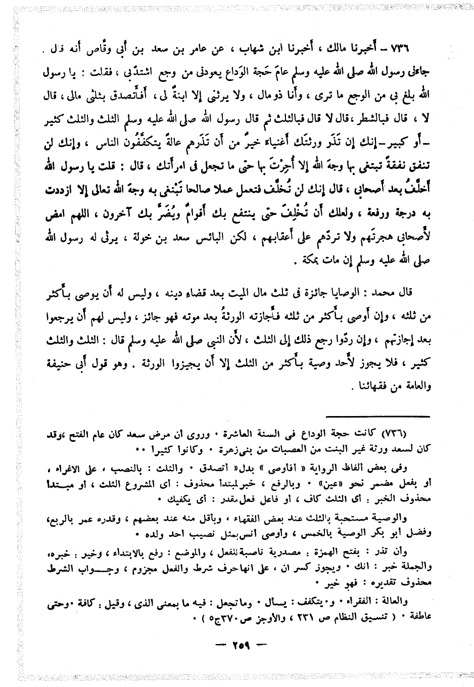 ٧٣٦ - أَخْبَرَنَا مَالِكٌ، أَخْبَرَنَا ابْنُ شِهَابٍ، عَنْ عَامِرِ بْنِ سَعْدِ بْنِ أَبِي وَقَّاصٍ، عَنْ سَعْدِ بْنِ أَبِي وَقَّاصٍ، أَنَّهُ قَالَ: جَاءَنِي رَسُولُ اللَّهِ صَلَّى اللَّهُ عَلَيْهِ وَسَلَّمَ عَامَ حَجَّةِ الْوَدَاعِ يَعُودُنِي مِنْ وَجَعٍ اشْتَدَّ بِي، فَقُلْتُ: يَا رَسُولَ اللَّهِ، بَلَغَ مِنِّي الْوَجَعُ مَا تَرَى، وَأَنَا ذُو مَالٍ، وَلا يَرِثُنِي إِلا ابْنَةٌ لِي، أَفَأَتَصَدَّقُ بِثُلُثَيْ مَالِي؟ قَالَ: «لا» ، قَالَ: فَبِالشَّطْرِ؟ قَالَ: «لا» ، قَالَ: فَبِالثُّلُثِ؟ ثُمَّ قَالَ رَسُولُ اللَّهِ صَلَّى اللَّهُ عَلَيْهِ وَسَلَّمَ: «الثُّلُثَ، وَالثُّلُثُ كَثِيرٌ، أَوْ كَبِيرٌ، إِنَّكَ إِنْ تَذَرْ وَرَثَتَكَ أَغْنِيَاءَ خَيْرٌ مِنْ أَنْ تَذَرَهُمْ عَالَةً يَتَكَفَّفُونَ النَّاسَ، وَإِنَّكَ لَنْ تُنْفِقَ نَفَقَةً تَبْتَغِي بِهَا وَجْهَ اللَّهِ تَعَالَى إِلا أُجِرْتَ بِهَا حَتَّى مَا تَجْعَلُ فِي امْرَأَتِكَ» ، قَالَ: قُلْتُ: يَا رَسُولَ اللَّهِ، أُخَلَّفُ بَعْدَ أَصْحَابِي؟ قَالَ: «إِنَّكَ لَنْ تُخَلَّفَ فَتَعْمَلَ عَمَلًا صَالِحًا تَبْتَغِي بِهِ وَجْهَ اللَّهِ تَعَالَى إِلا ازْدَدْتَ بِهِ دَرَجَةً وَرِفْعَةً، وَلَعَلَّكَ أَنْ تُخَلَّفَ حَتَّى يَنْتَفِعَ بِكَ أَقْوَامٌ، وَيُضَرَّ بِكَ آخَرُونَ، اللَّهم أَمْضِ لأَصْحَابِي هِجْرَتَهُمْ، وَلا تَرُدَّهُمْ عَلَى أَعْقَابِهِمْ، لَكِنِ الْبَائِسُ سَعْدُ بْنُ خَوْلَةَ، يَرْثِي لَهُ رَسُولُ اللَّهِ صَلَّى اللَّه عَلَيْهِ وَسَلَّمَ أَنْ مَاتَ بِمَكَّةَ» ، قَالَ مُحَمَّدٌ: الْوَصَايَا جَائِزَةٌ فِي ثُلُثِ مَالِ الْمَيِّتِ بَعْدَ قَضَاءِ دَيْنِهِ، وَلَيْسَ لَهُ أَنْ يُوصِيَ بِأَكْثَرَ مِنْهُ، فَإِنْ أَوْصَى بِأَكْثَرَ مِنْ ذَلِكَ، فَأَجَازَتْهُ الْوَرَثَةُ بَعْدَ مَوْتِهِ فَهُوَ جَائِزٌ، وَلَيْسَ لَهُمْ أَنْ يَرْجِعُوا بَعْدَ إِجَازَتِهِمْ، وَإِنْ رَدُّوا، رَجَعَ ذَلِكَ إِلَى الثُّلُثِ لأَنَّ النَّبِيَّ صَلَّى اللَّهُ عَلَيْهِ وَسَلَّمَ قَالَ: «الثُّلُثَ، وَالثُّلُثُ كَثِيرٌ» ، فَلا يَجُوزُ لأَحَدٍ وَصِيَّةٌ بِأَكْثَرَ مِنَ الثُّلُثِ إِلا أَنْ يُجِيزَ الْوَرَثَةُ.