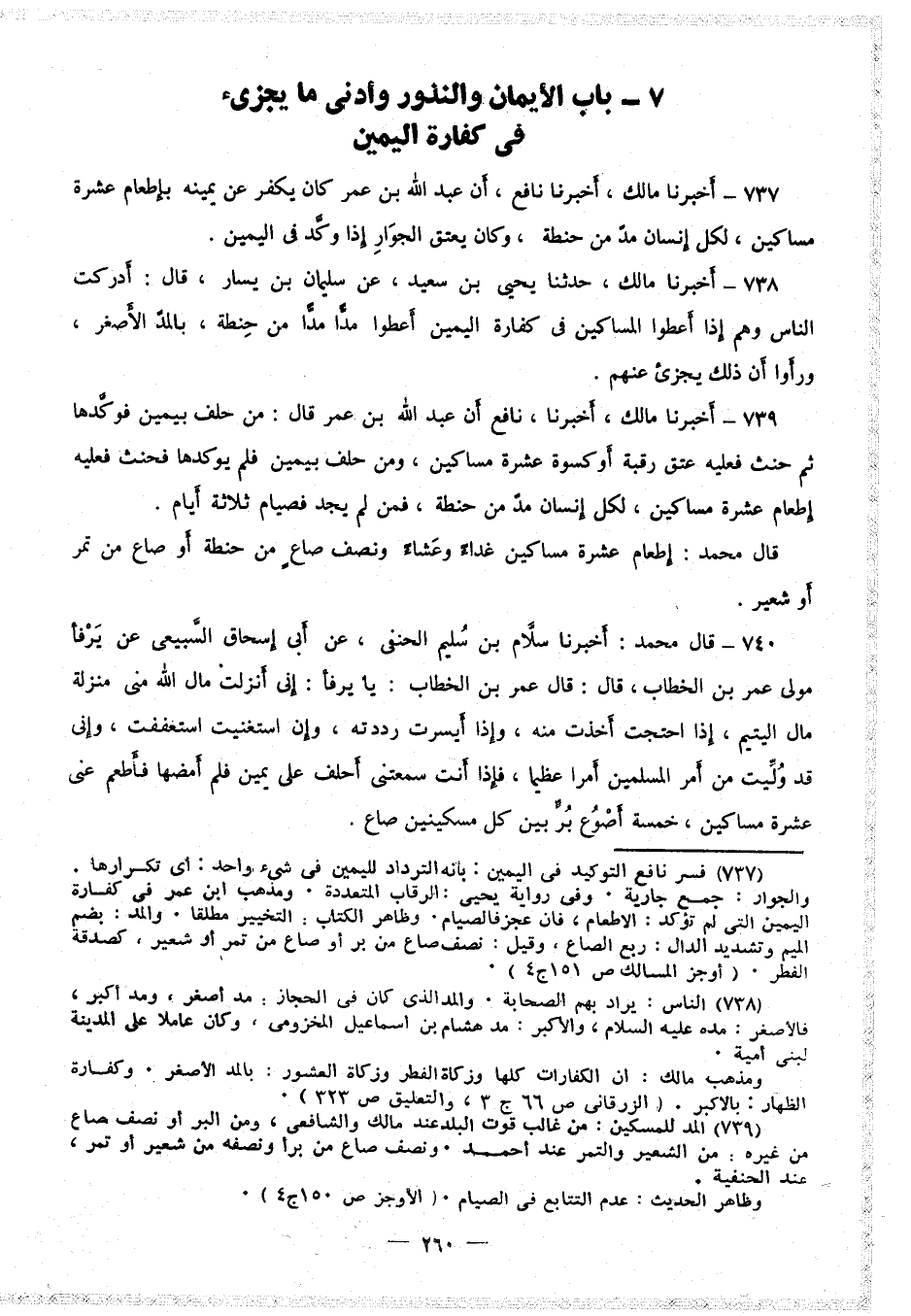 ٧٣٩ - أَخْبَرَنَا مَالِكٌ، أَخْبَرَنَا نَافِعٌ، أَنَّ عَبْدَ اللَّهِ بْنَ عُمَرَ، قَالَ: مَنْ حَلَفَ بِيَمِينٍ فَوَكَّدَهَا، ثُمَّ حَنَثَ، فَعَلَيْهِ عِتْقُ رَقَبَةٍ، أَوْ كِسْوَةُ عَشَرَةِ مَسَاكِينَ، وَمَنْ حَلَفَ بِيَمِينٍ، وَلَمْ يُؤَكِّدْهَا، فَحَنَثَ، فَعَلَيْهِ إِطْعَامُ عَشَرَةِ مَسَاكِينَ، لِكُلِّ مِسْكِينٍ مُدٌّ مِنْ حِنْطَةٍ، فَمَنْ لَمْ يَجِدْ فَصِيَامُ ثَلاثَةِ أَيَّامٍ، قَالَ مُحَمَّدٌ: إِطْعَامُ عَشَرَةِ مَسَاكِينَ غَدَاءً وَعَشَاءً، أَوْ نِصْفُ صَاعٍ مِنْ حِنْطَةٍ، أَوْ صَاعٌ مِنْ تَمْرٍ، أَوْ شَعِيرٍ