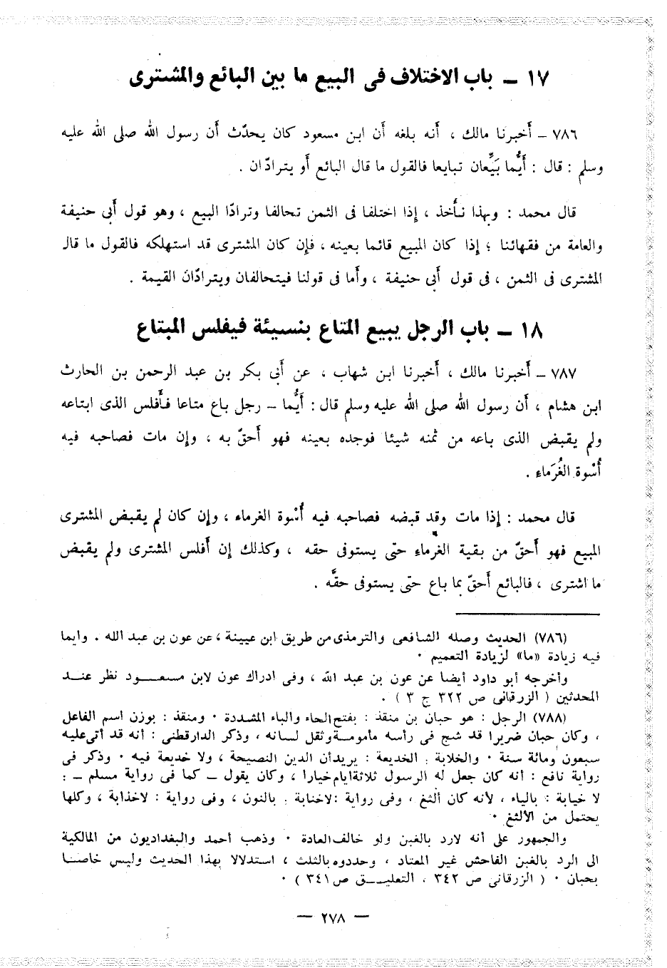 ٧٨٦ - أَخْبَرَنَا مَالِكٌ، أَنَّهُ بَلَغَهُ أَنَّ ابْنَ مَسْعُودٍ، كَانَ يُحَدِّثُ أَنَّ رَسُولَ اللَّهِ صَلَّى اللَّهُ عَلَيْهِ وَسَلَّمَ، قَالَ: «أَيُّمَا بَيِّعَانِ تَبَايَعَا، فَالْقَوْلُ قَوْلُ الْبَائِعِ، أَوْ يَتَرَادَّانِ» .