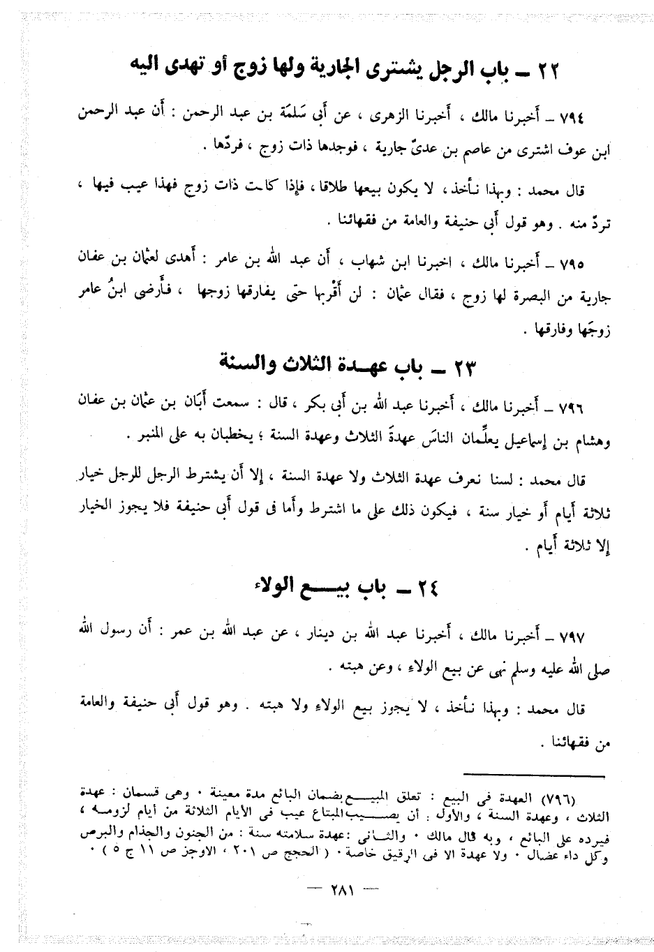 ٧٩٤ - أَخْبَرَنَا مَالِكٌ، أَخْبَرَنَا الزُّهْرِيُّ، عَنْ أَبِي سَلَمَةَ بْنِ عَبْدِ الرَّحْمَنِ، أَنَّ عَبْدَ الرَّحْمَنِ بْنَ عَوْفٍ «اشْتَرَى مِنْ عَاصِمِ بْنِ عَدِيٍّ جَارِيَةً، فَوَجَدَهَا ذَاتَ زَوْجٍ فَرَدَّهَا» .