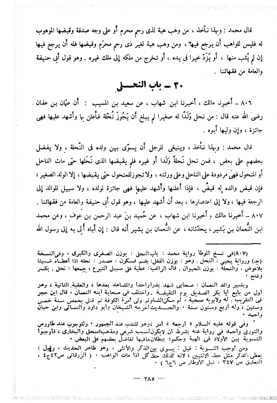 ٨٠٧ - أَخْبَرَنَا مَالِكٌ، أَخْبَرَنَا ابْنُ شِهَابٍ، عَنْ حُمَيْدِ بْنِ عَبْدِ الرَّحْمَنِ بْنِ عَوْفٍ، وَعَنْ مُحَمَّدِ بْنِ النُّعْمَانِ بْنِ بَشِيرٍ يُحَدِّثَانِهِ، عَنِ النُّعْمَانِ بْنِ بَشِيرٍ، قَالَ: إِنَّ أَبَاهُ أَتَى بِهِ إِلَى رَسُولِ اللَّهِ صَلَّى اللَّهُ عَلَيْهِ وَسَلَّمَ، فَقَالَ: إِنِّي نَحَلْتُ ابْنِي هَذَا غُلامًا كَانَ لِي، فَقَالَ رَسُولُ اللَّهِ ⦗٢٨٦⦘ صَلَّى اللَّهُ عَلَيْهِ وَسَلَّمَ: «أَكُلُّ وَلَدِكَ نَحَلْتَهُ مِثْلَ هَذَا؟» قَالَ: لا، قَالَ: «فَأَرْجِعْهُ»