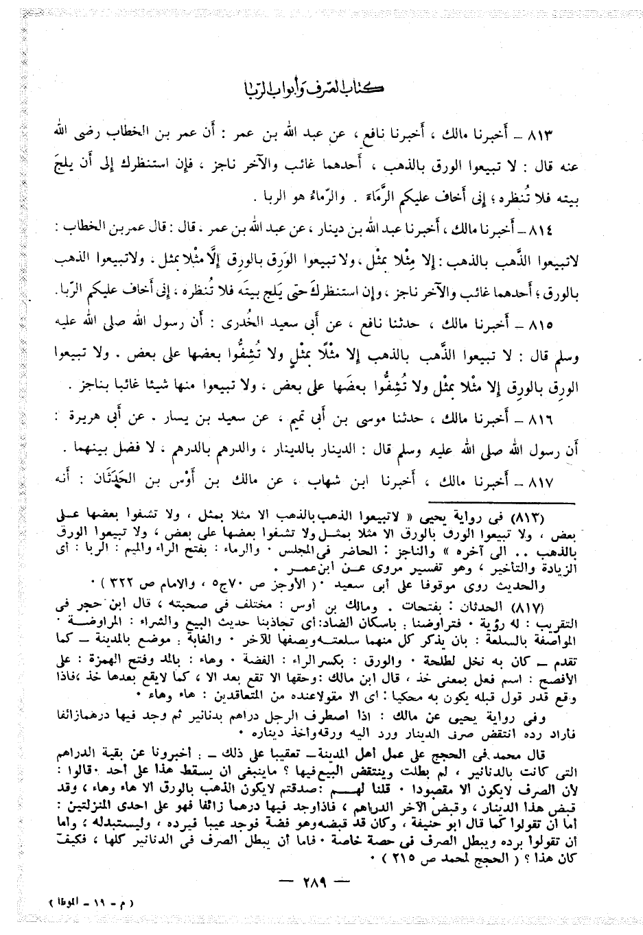 ٨١٧ - أَخْبَرَنَا مَالِكٌ، أَخْبَرَنَا ابْنُ شِهَابٍ، عَنْ مَالِكِ بْنِ أَوْسِ بْنِ الْحَدَثَانِ، أَنَّهُ ⦗٢٩٠⦘ أَخْبَرَهُ , أَنَّهُ الْتَمَسَ صَرْفًا بِمِائَةِ دِينَارٍ، وَقَالَ: فَدَعَانِي طَلْحَةُ بْنُ عُبَيْدِ اللَّهِ، فَقَالَ: فَتَرَاوَضْنَا حَتَّى اصْطَرَفَ مِنِّي، فَأَخَذَ طَلْحَةُ الذَّهَبَ يُقَلِّبُهَا فِي يَدِهِ، ثُمَّ قَالَ: حَتَّى يَأْتِيَنِي خَازِنِي مِنَ الْغَابَةِ، وَعُمَرُ بْنُ الْخَطَّابِ يَسْمَعُ كَلامَهُ، فَقَالَ: لا، وَاللَّهِ لا تُفَارِقْهُ حَتَّى تَأْخُذَ مِنْهُ، ثُمَّ قَالَ: قَالَ رَسُولُ اللَّهِ صَلَّى اللَّهُ عَلَيْهِ وَسَلَّمَ: «الذَّهَبُ بِالْفِضَّةِ رِبًا إِلا هَاءَ وَهَاءَ، وَالتَّمْرُ بِالتَّمْرِ رِبًا إِلا هَاءَ وَهَاءَ، وَالشَّعِيرُ بِالشَّعِيرِ رِبًا إِلا هَاءَ وَهَاءَ»