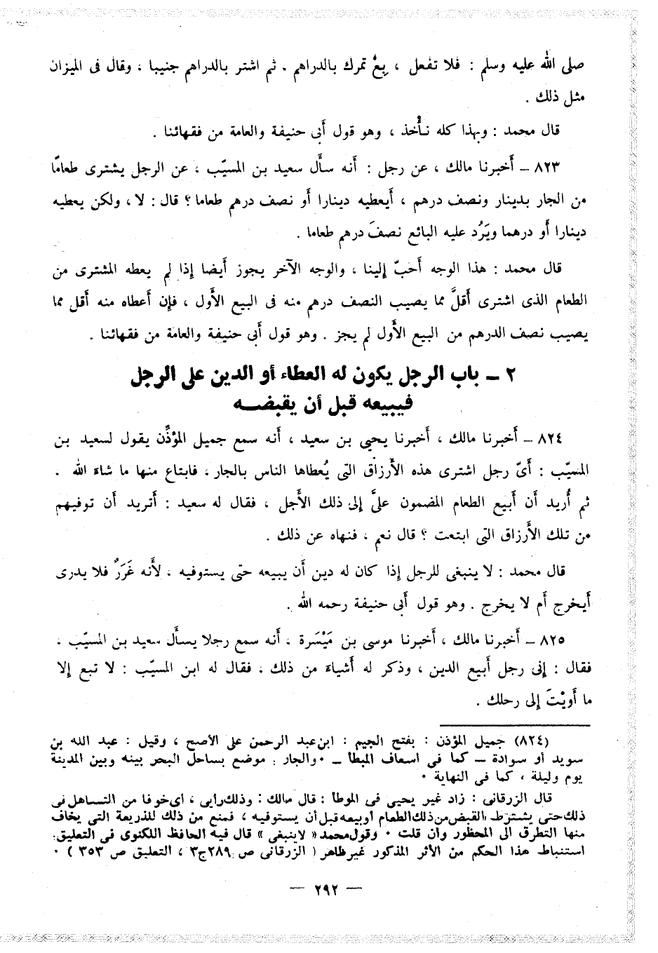 ٨٢٤ - أَخْبَرَنَا مَالِكٌ، أَخْبَرَنَا يَحْيَى بْنُ سَعِيدٍ، أَنَّهُ سَمِعَ جَمِيلًا الْمُؤَذِّنَ، يَقُولُ لِسَعِيدِ بْنِ الْمُسَيِّبِ: إِنِّي رَجُلٌ أَشْتَرِي هَذِهِ الأَرْزَاقَ الَّتِي يُعْطِيهَا النَّاسُ بِالْجَارِ، فَأَبْتَاعُ مِنْهَا مَا شَاءَ اللَّهُ، ثُمَّ أُرِيدُ أَنْ أَبِيعَ الطَّعَامَ الْمَضْمُونَ عَلَيَّ إِلَى ذَلِكَ الأَجَلِ، فَقَالَ لَهُ سَعِيدٌ: أَتُرِيدُ أَنْ تُوَفِّيَهُمْ مِنْ تِلْكَ الأَرْزَاقِ الَّتِي ابْتَعْتَ؟ قَالَ: نَعَمْ، فَنَهَاهُ عَنْ ذَلِكَ.