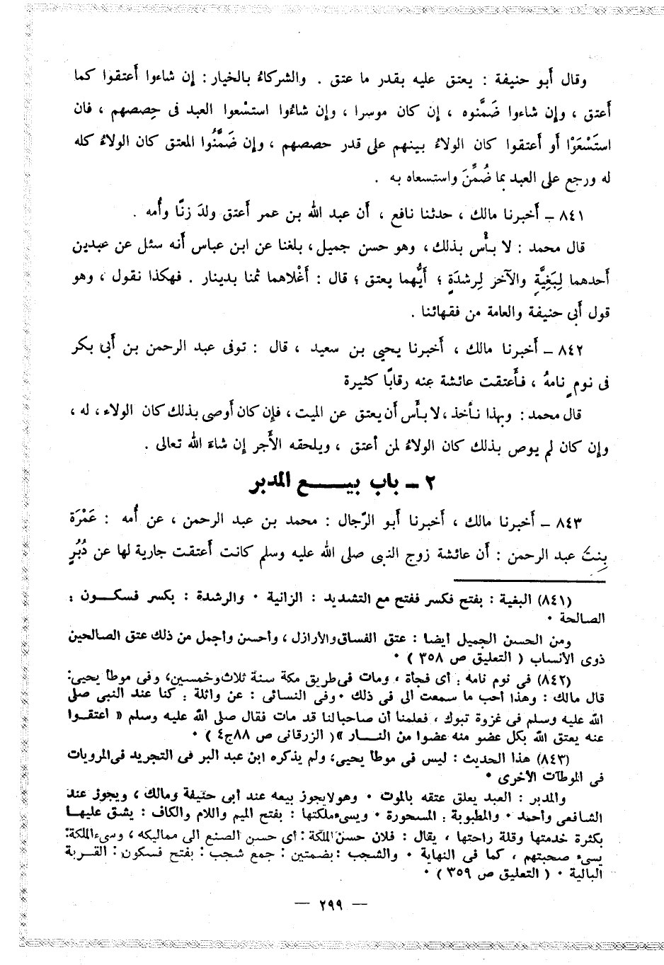 ٨٤٣ - أَخْبَرَنَا مَالِكٌ، أَخْبَرَنَا أَبُو الرِّجَالِ مُحَمَّدُ بْنُ عَبْدِ الرَّحْمَنِ، عَنْ أُمِّهِ عَمْرَةَ بِنْتِ عَبْدِ الرَّحْمَنِ، أَنَّ عَائِشَةَ زَوْجَ النَّبِيِّ صَلَّى اللَّهُ عَلَيْهِ وَسَلَّمَ، كَانَتْ أَعْتَقَتْ جَارِيَةً لَهَا عَنْ دُبُرٍ ⦗٣٠٠⦘ مِنْهَا، ثُمَّ إِنَّ عَائِشَةَ رَضِيَ اللَّهُ عَنْهَا بَعْدَ ذَلِكَ اشْتَكَتْ مَا شَاءَ اللَّهُ أَنْ تَشْتَكِيَ، ثُمَّ إِنَّهُ دَخَلَ عَلَيْهَا رَجُلٌ سِنْدِيٌّ، فَقَالَ لَهَا، أَنْتِ مَطبُوبَةٌ، فَقَالَتْ لَهُ عَائِشَةُ: وَيْلَكَ، مَنْ طَبَّنِي؟ قَالَ: امْرَأَةٌ مِنْ نَعْتِهَا كَذَا وَكَذَا، فَوَصَفَهَا، وَقَالَ: إِنَّ فِي حَجْرِهَا الآنَ صَبِيًّا قَدْ بَالَ، فَقَالَتْ عَائِشَةُ: ادْعُوا لِي فُلانَةً جَارِيَةً كَانَتْ تَخْدُمُهَا، فَوَجَدُوهَا فِي بَيْتِ جِيرَانٍ لَهُمْ فِي حَجْرِهَا صَبِيٌّ، قَالَتْ: الآنَ حَتَّى أَغْسِلَ بَوْلَ هَذَا الصَّبِيِّ، فَغَسَلَتْهُ ثُمَّ جَاءَتْ، فَقَالَتْ لَهَا عَائِشَةُ: أَسَحَرْتِنِي؟ قَالَتْ: نَعَمْ، قَالَتْ: لِمَ؟ قَالَتْ: أَحْبَبْتُ الْعِتْقَ، قَالَتْ: فَوَاللَّهِ لا تَعْتَقِينَ أَبَدًا، ثُمَّ أَمَرَتْ عَائِشَةُ ابْنَ أُخْتِهَا أَنْ يَبِيعَهَا مِنَ الأَعْرَابِ مِمَّنْ يُسِيءُ مَلْكَتَهَا، قَالَتْ: ثُمَّ ابْتَعْ لِي بِثَمَنِهَا رَقَبَةً، ثُمَّ أَعْتِقْهَا، فَقَالَتْ عَمْرَةُ: فَلَبِثَتْ عَائِشَةُ رَضِيَ اللَّهُ عَنْهَا مَا شَاءَ اللَّهُ مِنَ الزَّمَانِ، ثُمَّ إِنَّهَا رَأَتْ فِي الْمَنَامِ أَنِ اغْتَسِلِي مِنْ آبَارٍ ثَلاثَةٍ يَمُدُّ بَعْضُهَا بَعْضا، فَإِنَّكِ تُشْفَيْنَ، فَدَخَلَ عَلَى عَائِشَةَ إِسْمَاعِيلُ بْنُ أَبِي بَكْرٍ، وَعَبْدُ الرَّحْمَنِ بْنُ سَعْدِ بْنِ زُرَارَةَ، فَذَكَرَتْ أُمُّ عَائِشَةَ الَّذِي رَأَتْ، فَانْطَلَقَا إِلَى قَنَاةٍ، فَوَجَدَا آبَارًا ثَلاثَةً يَمُدُّ بَعْضُهَا بَعْضًا، فَاسْتَقَوْا مِنْ كُلِّ بِئْرٍ مِنْهَا ثَلاثَ شُجُبٍ حَتَّى مَلَئُوا الشُّجُبَ مِنْ جَمِيعِهَا، ثُمَّ أَتَوْا بِذَلِكَ الْمَاءِ إِلَى عَائِشَةَ، فَاغْتَسَلَتْ فِيهِ فَشُفِيَتْ.