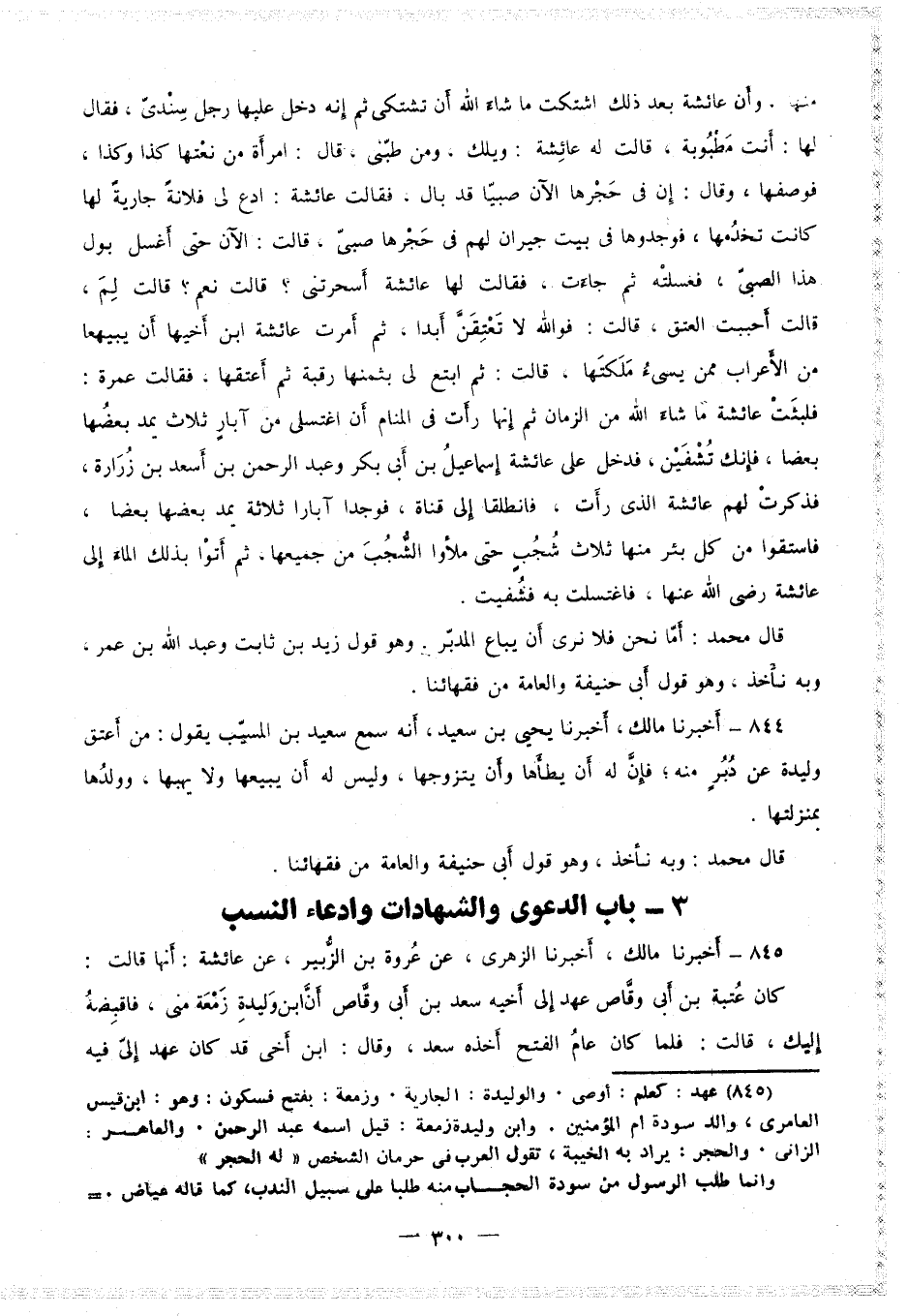 ٨٤٥ - أَخْبَرَنَا مَالِكٌ، أَخْبَرَنَا الزُّهْرِيُّ، عَنْ عُرْوَةَ بْنِ الزُّبَيْرِ، عَنْ عَائِشَةَ، رَضِيَ اللَّهُ عَنْهَا قَالَتْ: كَانَ عُتْبَةُ بْنُ أَبِي وَقَّاصٍ عَهِدَ إِلَى أَخِيهِ سَعْدِ بْنِ أَبِي وَقَّاصٍ أَنَّ ابْنَ وَلِيدَةِ زَمْعَةَ مِنِّي، فَاقْبِضْهُ إِلَيْكَ، قَالَتْ: فَلَمَّا كَانَ عَامُ الْفَتْحِ أَخَذَهُ سَعْدٌ، وَقَالَ: ابْنُ أخِي، قَدْ كَانَ عَهِدَ إِلَيَّ ⦗٣٠١⦘ أَخِي فِيهِ، فَقَامَ إِلَيْهِ عَبْدُ بْنُ زَمْعَةَ، فَقَالَ: أَخِي، وَابْنُ وَلِيدَةِ أَبِي، وُلِدَ عَلَى فِرَاشِهِ، فَتَسَاوَقَا إِلَى رَسُولِ اللَّهِ صَلَّى اللَّهُ عَلَيْهِ وَسَلَّمَ، فَقَالَ سَعْدٌ: يَا رَسُولَ اللَّهِ، ابْنُ أَخِي، قَدْ كَانَ عَهِدَ إِلَيَّ فِيهِ أَخِي عُتْبَةُ، وَقَالَ عَبْدُ بْنُ زَمْعَةَ: أَخِي، ابْنُ وَلِيدَةِ أَبِي، وُلِدَ عَلَى فِرَاشِهِ، فَقَالَ رَسُولُ اللَّهِ صَلَّى اللَّهُ عَلَيْهِ وَسَلَّمَ: " هُوَ لَكَ يَا عَبْدُ بْنَ زَمْعَةَ، ثُمَّ قَالَ: «الْوَلَدُ لِلْفِرَاشِ وَلِلْعَاهِرِ الْحَجَرِ» ، ثُمَّ قَالَ لِسَوْدَةَ بِنْتِ زَمْعَةَ: احْتَجِبِي مِنْهُ لِمَا رَأَى مِنْ شَبَهِهِ بِعُتْبَةَ، فَمَا رَآهَا حَتَّى لَقِيَ اللَّهَ عَزَّ وَجَلَّ، قَالَ مُحَمَّدٌ: وَبِهَذَا نَأْخُذُ، الْوَلَدُ لِلْفِرَاشِ، وَلِلْعَاهِرِ الْحَجَرُ.