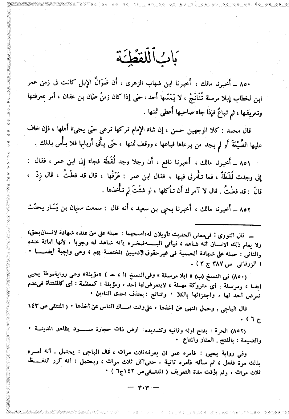 ٨٥٠ - أَخْبَرَنَا مَالِكٌ، أَخْبَرَنَا ابْنُ شِهَابٍ الزُّهْرِيُّ، أَنَّ ضَوَالَّ الإِبِلِ كَانَتْ فِي زَمَنِ عُمَرَ رَضِيَ اللَّهُ عَنْهُ إِبِلا مُرْسَلَةً تَنَاتَجُ، لا يَمَسُّهَا أَحَدٌ، حَتَّى إِذَا كَانَ مِنْ زَمَنِ عُثْمَانَ بْنِ عَفَّانَ أَمَرَ بِمَعْرِفَتِهَا، وَتَعْرِيفِهَا، ثُمَّ تُبَاعُ، فَإِذَا جَاءَ صَاحِبُهَا أُعْطِيَ ثَمَنَهَا ".