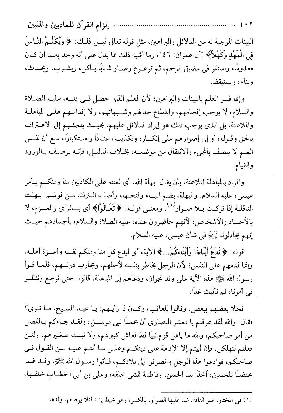 فقال: والله لقد عرفتم يا معشر النصارى أن محمدا نبى مرسل، ولقد جاءكم بالفصل من أمر صاحبكم، والله ما باهل قوم نبيا قط فعاش كبيرهم، ولا نبت صغيرهم، ولئن فعلتم لنهلكن، فإن أبيتم إلا الإقامة على دينكم وعلى ما أنتم عليه من القول فى صاحبكم، فوادعوا هذا الرجل وانصرفوا إلى بلادكم، فأتوا رسول الله صلى الله عليه وسلم،