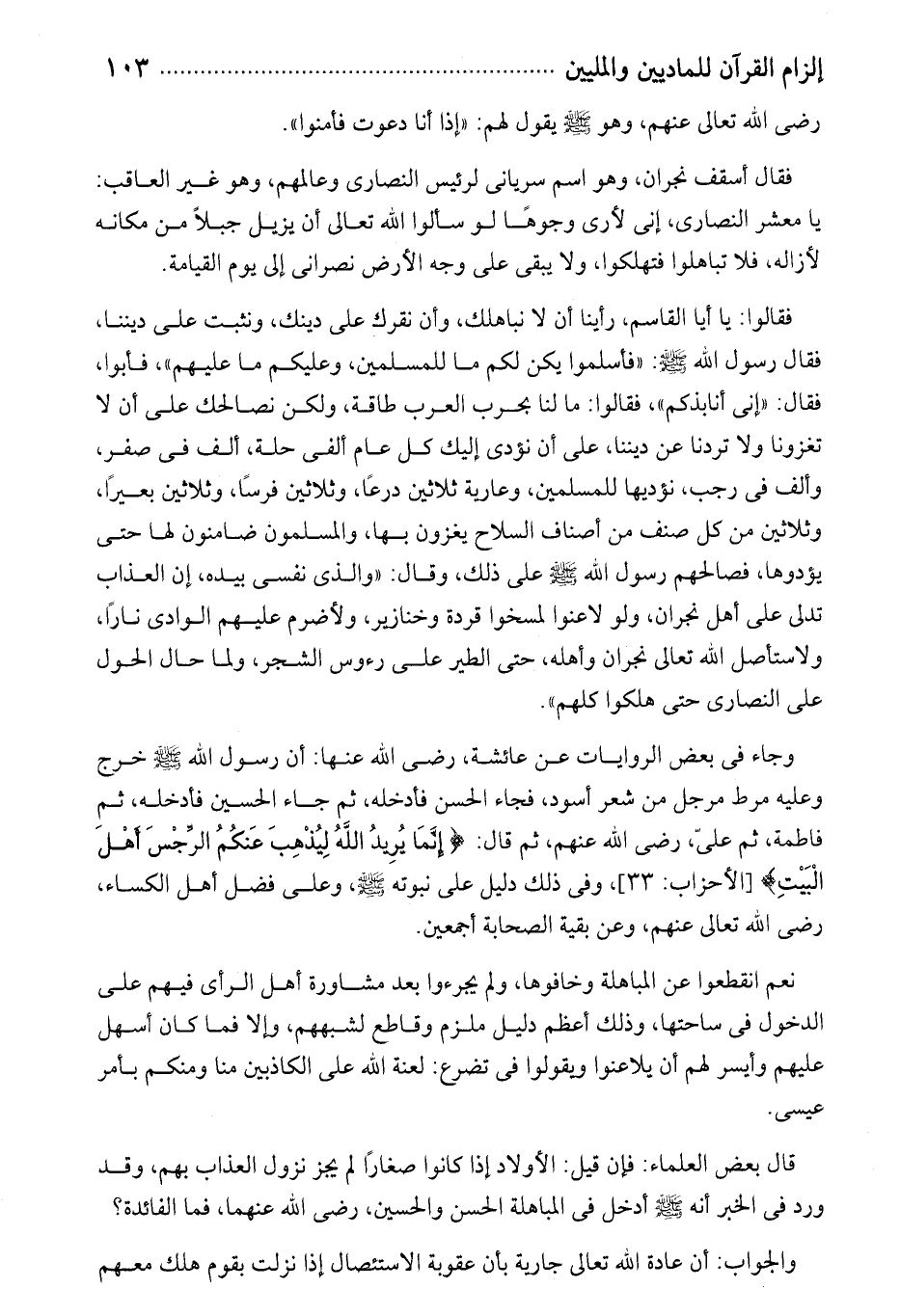 فقالوا: يا أيا القاسم، رأينا أن لا نباهلك، وأن نقرك على دينك، ونثبت على ديننا، فقال رسول الله صلى الله عليه وسلم: «فأسلموا يكن لكم ما للمسلمين، وعليكم ما عليهم»، فأبوا، فقال: «إنى أنابذكم»، فقالوا: ما لنا بحرب العرب طاقة، ولكن نصالحك على أن لا تغزونا ولا تردنا عن ديننا، على أن نؤدى إليك كل عام ألفى حلة، ألف فى صفر، وألف فى رجب، نؤديها للمسلمين، وعارية ثلاثين درعا، وثلاثين فرسا، وثلاثين بعيرا، وثلاثين من كل صنف من أصناف السلاح يغزون بها، والمسلمون ضامنون لها حتى يؤدوها، فصالحهم رسول الله صلى الله عليه وسلم على ذلك، وقال: «والذى نفسى بيده، إن العذاب تدلى على أهل نجران، ولو لاعنوا لمسخوا قردة وخنازير، ولأضرم عليهم الوادى نارا، ولاستأصل الله تعالى نجران وأهله، حتى الطير على رءوس الشجر، ولما حال الحول على النصارى حتى هلكوا كلهم».