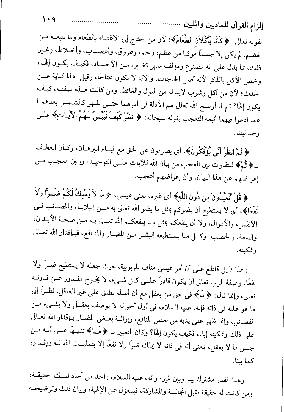 بقوله تعالى: كانا يَأْكُلانِ الطَّعامَ؛ لأن من احتاج إلى الاغتذاء بالطعام وما يتبعه من الهضم، لم يكن إلا جسما مركبا من عظم، ولحم، وعروق، وأعصاب، وأخلاط، وغير ذلك، مما يدل على أنه مصنوع ومؤلف مدبر كغيره من الأجساد، فكيف يكون إلها، وخص الأكل بالذكر لأنه أصل الحاجات، والإله لا يكون محتاجا، وقيل: هذا كناية عن الحدث؛ لأن من أكل وشرب لا بدّ له من البول والغائط، ومن كانت هذه صفته، كيف يكون إلها؟ ثم لما أوضح الله تعالى لهم الأدلة فى أمرهما حتى ظهر كالشمس بعدهما عما ادعوا فيهما أتبعه التعجب بقوله سبحانه: انْظُرْ كَيْفَ نُبَيِّنُ لَهُمُ الْآياتِ على وحدانيتنا.