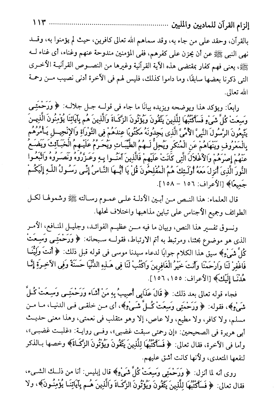 رابعا: ويؤكد هذا ويوضحه ويزيده بيانا ما جاء فى قوله جل جلاله: وَرَحْمَتِي وَسِعَتْ كُلَّ شَيْءٍ فَسَأَكْتُبُها لِلَّذِينَ يَتَّقُونَ وَيُؤْتُونَ الزَّكاةَ وَالَّذِينَ هُمْ بِآياتِنا يُؤْمِنُونَ الَّذِينَ يَتَّبِعُونَ الرَّسُولَ النَّبِيَّ الْأُمِّيَّ الَّذِي يَجِدُونَهُ مَكْتُوباً عِنْدَهُمْ فِي التَّوْراةِ وَالْإِنْجِيلِ يَأْمُرُهُمْ بِالْمَعْرُوفِ وَيَنْهاهُمْ عَنِ الْمُنْكَرِ وَيُحِلُّ لَهُمُ الطَّيِّباتِ وَيُحَرِّمُ عَلَيْهِمُ الْخَبائِثَ وَيَضَعُ عَنْهُمْ إِصْرَهُمْ وَالْأَغْلالَ الَّتِي كانَتْ عَلَيْهِمْ فَالَّذِينَ آمَنُوا بِهِ وَعَزَّرُوهُ وَنَصَرُوهُ وَاتَّبَعُوا النُّورَ الَّذِي أُنْزِلَ مَعَهُ أُولئِكَ هُمُ الْمُفْلِحُونَ قُلْ يا أَيُّهَا النَّاسُ إِنِّي رَسُولُ اللَّهِ إِلَيْكُمْ جَمِيعاً [الأعراف: 156 - 158].