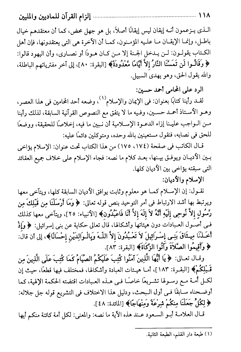 قال الكاتب فى صفحة (174، 175) من هذا الكتاب تحت عنوان: الإسلام يؤاخى بين الأديان ويوفق بينها، بعد كلام ما نصه: فجاء الإسلام على خلاف جميع العقائد التى سبقته يؤاخى بين الأديان كلها.