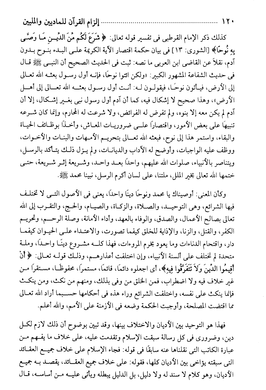 فهذا هو التوحيد بين الأديان والاختلاف بينها، وقد تبين بوضوح أن ذلك لازم لكل دين، وضرورى فى كل رسالة سبقت الإسلام وتقدمت عليه، على خلاف ما يفهم من عبارة الكاتب التى نقلناها عنه سابقا فى قوله: فجاء الإسلام على خلاف جميع العقائد التى سبقته يؤاخى بين الأديان كلها، فقوله: على خلاف جميع العقائد، يقصد به جميع الأديان، وهو كلام لا سند له ولا دليل، بل الدليل يبطله ويأتى عليه من أساسه، قال
