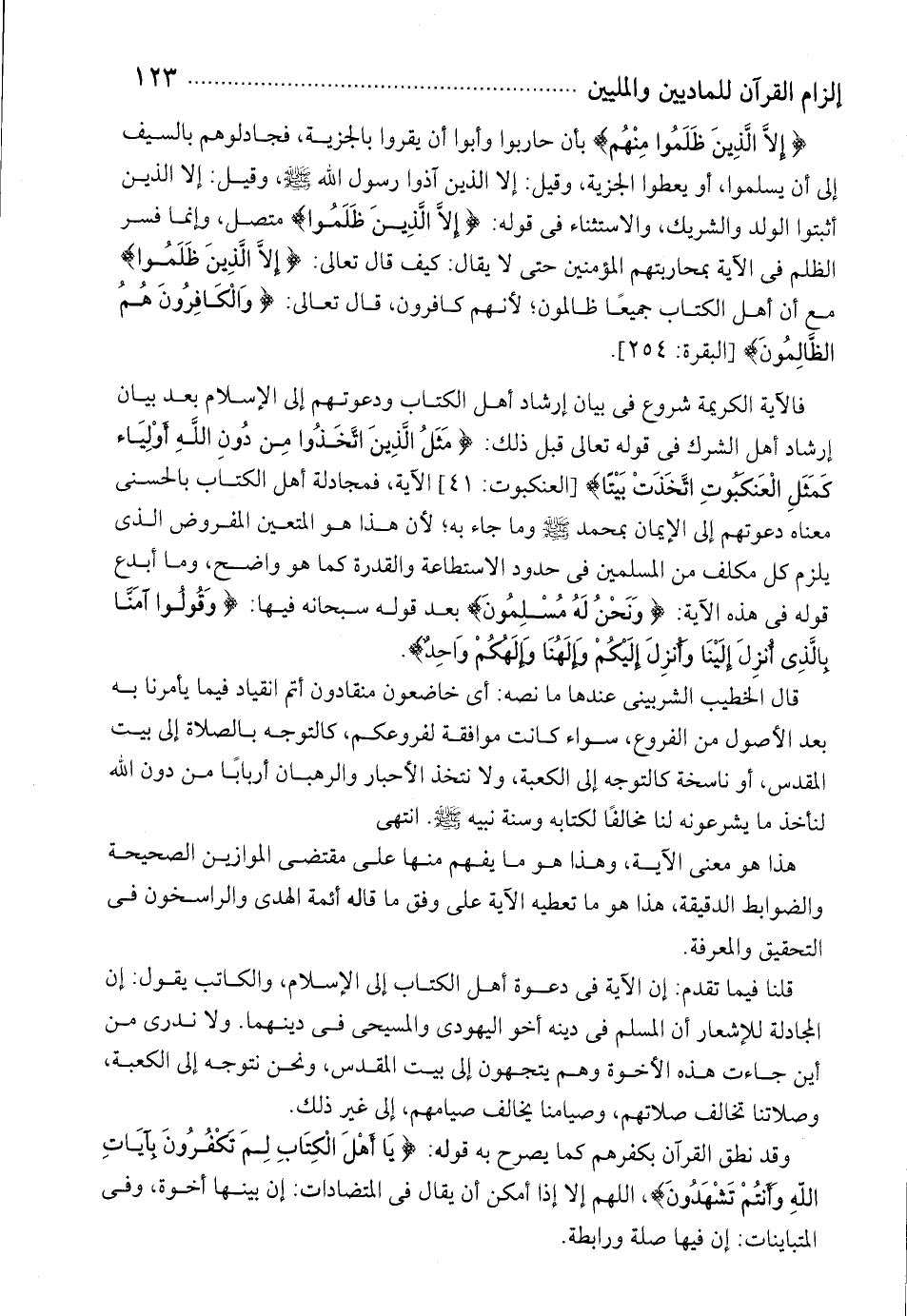 إِلَّا الَّذِينَ ظَلَمُوا مِنْهُمْ بأن حاربوا وأبوا أن يقروا بالجزية، فجادلوهم بالسيف إلى أن يسلموا، أو يعطوا الجزية، وقيل: إلا الذين آذوا رسول الله صلى الله عليه وسلم، وقيل: إلا الذين أثبتوا الولد والشريك، والاستثناء فى قوله: إِلَّا الَّذِينَ ظَلَمُوا متصل، وإنما فسر الظلم فى الآية بمحاربتهم المؤمنين حتى لا يقال: كيف قال تعالى: إِلَّا الَّذِينَ ظَلَمُوا مع أن أهل الكتاب جميعا ظالمون؛ لأنهم كافرون، قال تعالى: وَالْكافِرُونَ هُمُ الظَّالِمُونَ [البقرة: 254].