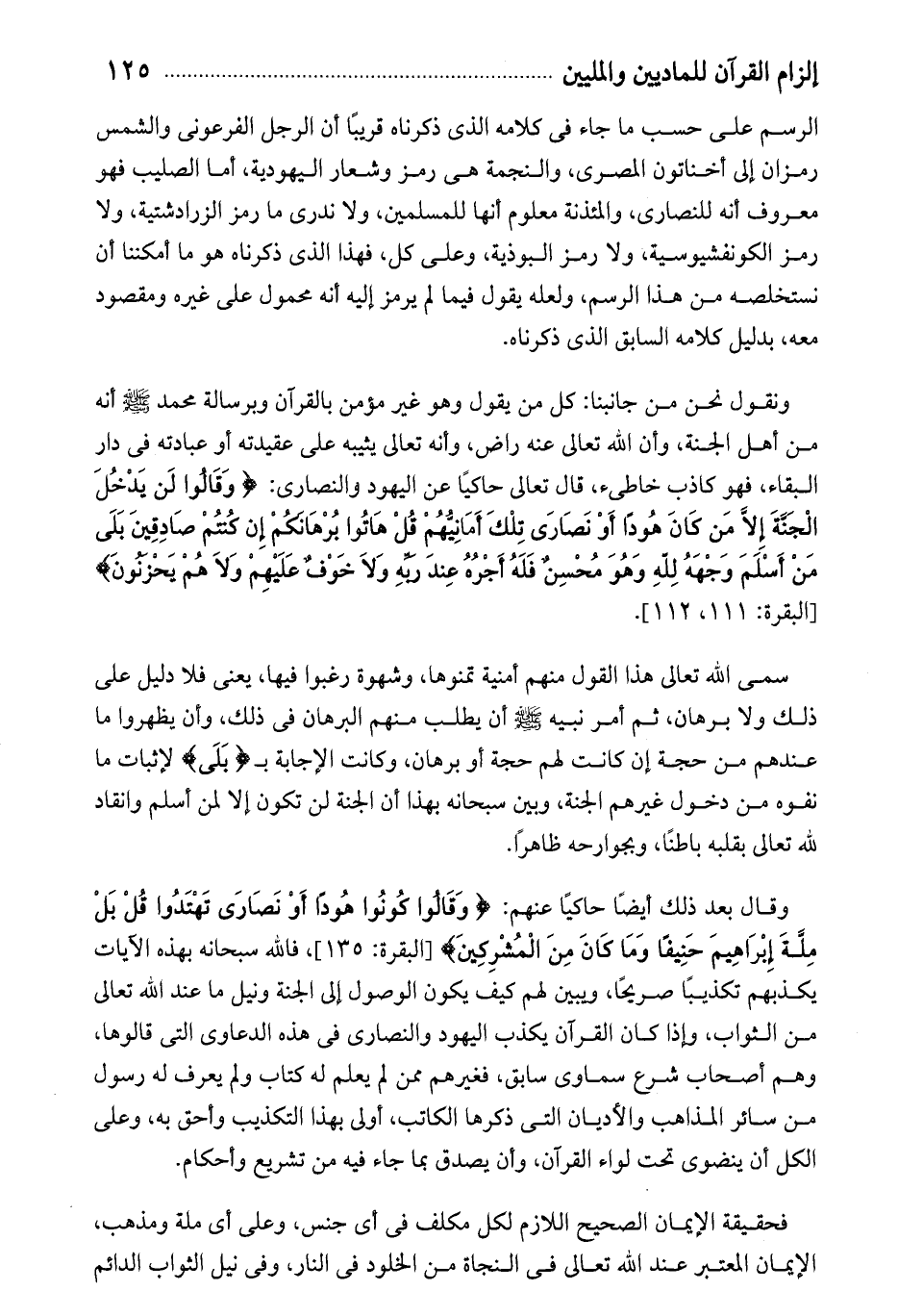 وقال بعد ذلك أيضا حاكيا عنهم: وَقالُوا كُونُوا هُوداً أَوْ نَصارى تَهْتَدُوا قُلْ بَلْ مِلَّةَ إِبْراهِيمَ حَنِيفاً وَما كانَ مِنَ الْمُشْرِكِينَ [البقرة: 135]، فالله سبحانه بهذه الآيات يكذبهم تكذيبا صريحا، ويبين لهم كيف يكون الوصول إلى الجنة ونيل ما عند الله تعالى من الثواب، وإذا كان القرآن يكذب اليهود والنصارى فى هذه الدعاوى التى قالوها، وهم أصحاب شرع سماوى سابق، فغيرهم ممن لم يعلم له كتاب ولم يعرف له رسول من سائر المذاهب والأديان التى ذكرها الكاتب، أولى بهذا التكذيب وأحق به، وعلى الكل أن ينضوى تحت لواء القرآن، وأن يصدق بما جاء فيه من تشريع وأحكام.