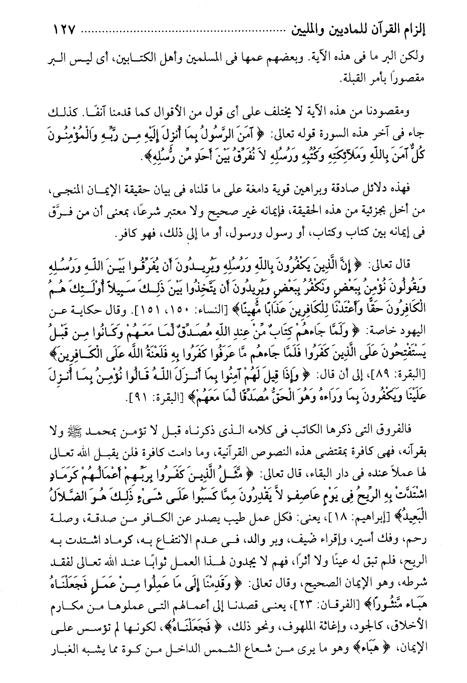 فالفروق التى ذكرها الكاتب فى كلامه الذى ذكرناه قبل لا تؤمن بمحمد صلى الله عليه وسلم ولا بقرآنه، فهى كافرة بمقتضى هذه النصوص القرآنية، وما دامت كافرة فلن يقبل الله تعالى لها عملا عنده فى دار البقاء، قال تعالى: مَثَلُ الَّذِينَ كَفَرُوا بِرَبِّهِمْ أَعْمالُهُمْ كَرَمادٍ اشْتَدَّتْ بِهِ الرِّيحُ فِي يَوْمٍ عاصِفٍ لا يَقْدِرُونَ مِمَّا كَسَبُوا عَلى شَيْءٍ ذلِكَ هُوَ الضَّلالُ الْبَعِيدُ [إبراهيم: 18]، يعنى: فكل عمل طيب يصدر عن الكافر من صدقة، وصلة رحم، وفك أسير، وإقراء ضيف، وبر والد، فى عدم الانتفاع به، كرماد اشتدت به الريح، فلم تبق له عينا ولا أثرا، فهم لا يجدون لهذا العمل ثوابا عند الله تعالى لفقد شرطه، وهو الإيمان الصحيح، وقال تعالى: وَقَدِمْنا إِلى ما عَمِلُوا مِنْ عَمَلٍ فَجَعَلْناهُ هَباءً مَنْثُوراً [الفرقان: 23]، يعنى قصدنا إلى أعمالهم التى عملوها من مكارم الأخلاق، كالجود، وإغاثة الملهوف، ونحو ذلك، فَجَعَلْناهُ، لكونها لم تؤسس على الإيمان، هَباءً وهو ما يرى من شعاع الشمس الداخل من كوة مما يشبه الغبار
