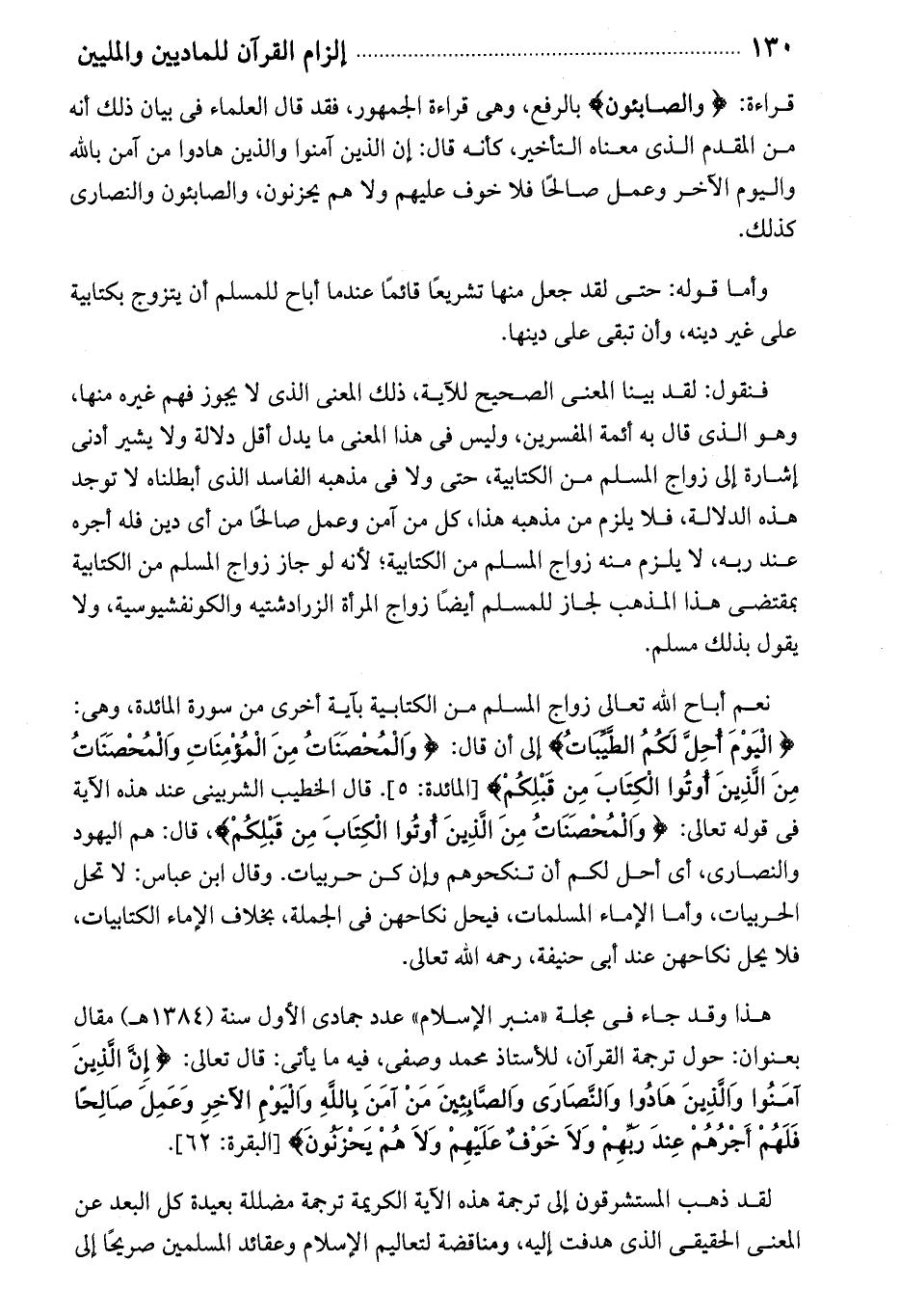 فنقول: لقد بينا المعنى الصحيح للآية، ذلك المعنى الذى لا يجوز فهم غيره منها، وهو الذى قال به أئمة المفسرين، وليس فى هذا المعنى ما يدل أقل دلالة ولا يشير أدنى إشارة إلى زواج المسلم من الكتابية، حتى ولا فى مذهبه الفاسد الذى أبطلناه لا توجد هذه الدلالة، فلا يلزم من مذهبه هذا، كل من آمن وعمل صالحا من أى دين فله أجره عند ربه، لا يلزم منه زواج المسلم من الكتابية؛ لأنه لو جاز زواج المسلم من الكتابية بمقتضى هذا المذهب لجاز للمسلم أيضا زواج المرأة الزرادشتية والكونفشيوسية، ولا يقول بذلك مسلم.