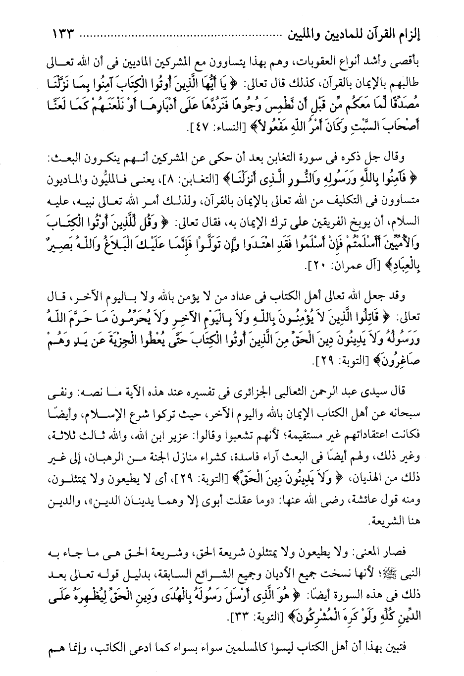 بأقصى وأشد أنواع العقوبات، وهم بهذا يتساوون مع المشركين الماديين فى أن الله تعالى طالبهم بالإيمان بالقرآن، كذلك قال تعالى: يا أَيُّهَا الَّذِينَ أُوتُوا الْكِتابَ آمِنُوا بِما نَزَّلْنا مُصَدِّقاً لِما مَعَكُمْ مِنْ قَبْلِ أَنْ نَطْمِسَ وُجُوهاً فَنَرُدَّها عَلى أَدْبارِها أَوْ نَلْعَنَهُمْ كَما لَعَنَّا أَصْحابَ السَّبْتِ وَكانَ أَمْرُ اللَّهِ مَفْعُولًا [النساء: 47].