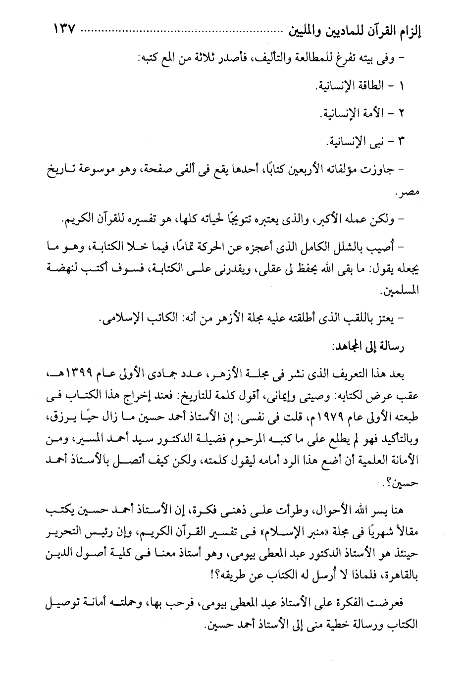 هنا يسر الله الأحوال، وطرأت على ذهنى فكرة، إن الأستاذ أحمد حسين يكتب مقالا شهريا فى مجلة «منبر الإسلام» فى تفسير القرآن الكريم، وإن رئيس التحرير حينئذ هو الأستاذ الدكتور عبد المعطى بيومى، وهو أستاذ معنا فى كلية أصول الدين بالقاهرة، فلماذا لا أرسل له الكتاب عن طريقه؟! فعرضت الفكرة على الأستاذ عبد المعطى بيومى، فرحب بها، وحملته أمانة توصيل الكتاب ورسالة خطية منى إلى الأستاذ أحمد حسين.