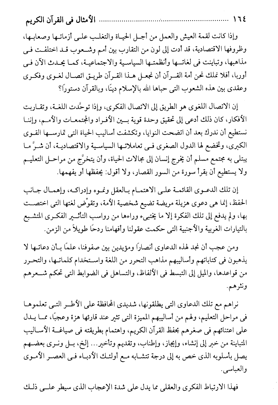 وإذا كانت لقمة العيش والعمل من أجل الحياة والتغلب على أزماتها وصعابها، وظروفها الاقتصادية، قد أدت إلى لون من التقارب بين أمم وشعوب قد اختلفت فى مذاهبها، وتباينت فى لغاتها وأنظمتها السياسية والاجتماعية، كما يحدث الآن فى أوربا، أفلا نملك نحن أمة القرآن أن نجعل هذا القرآن طريق اتصال لغوى وفكرى وعقدى بين هذه الشعوب التى حباها الله بالإسلام دينا، وبالقرآن دستورا؟