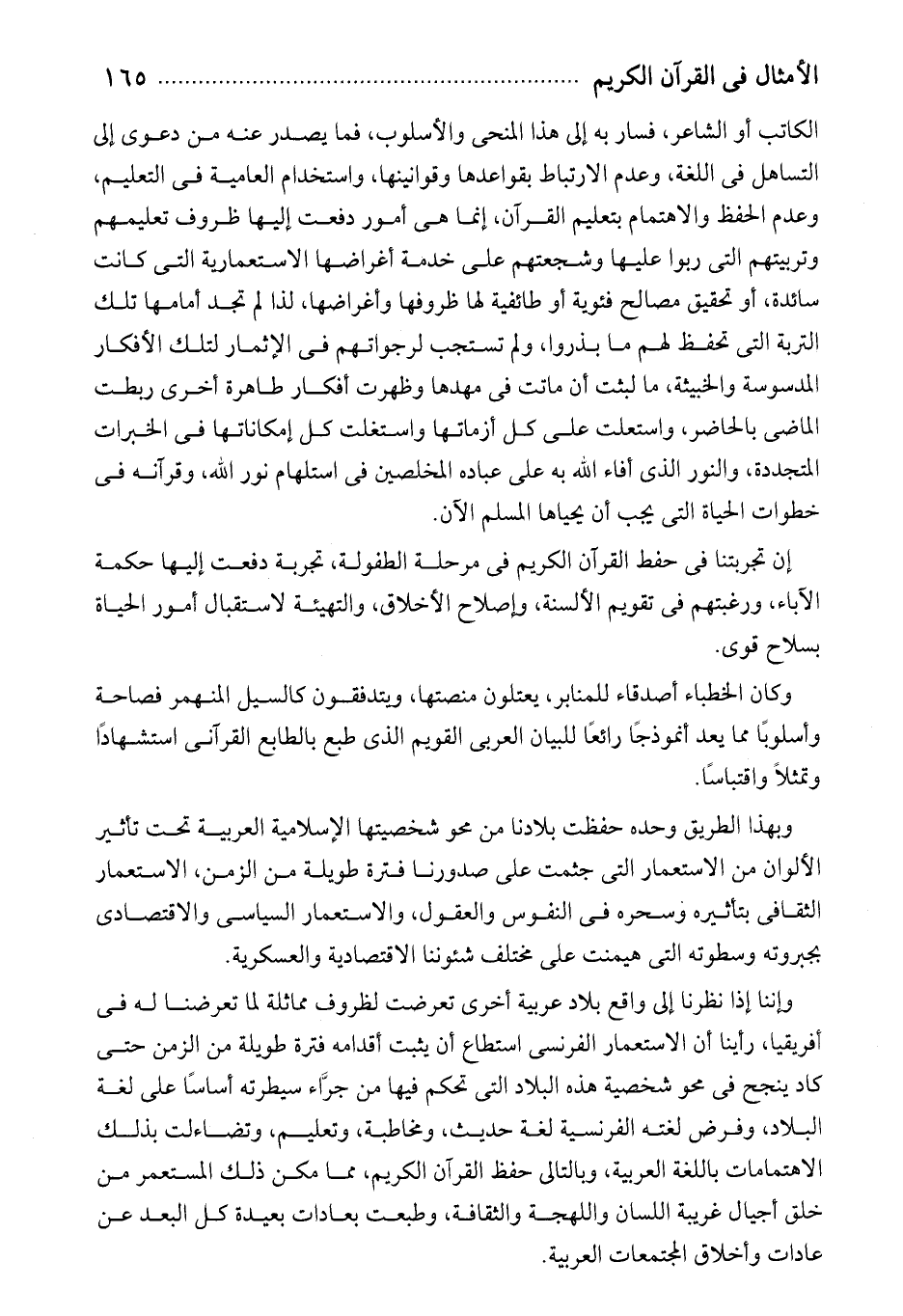 الكاتب أو الشاعر، فسار به إلى هذا المنحى والأسلوب، فما يصدر عنه من دعوى إلى التساهل فى اللغة، وعدم الارتباط بقواعدها وقوانينها، واستخدام العامية فى التعليم، وعدم الحفظ والاهتمام بتعليم القرآن، إنما هى أمور دفعت إليها ظروف تعليمهم وتربيتهم التى ربوا عليها وشجعتهم على خدمة أغراضها الاستعمارية التى كانت سائدة، أو تحقيق مصالح فئوية أو طائفية لها ظروفها وأغراضها، لذا لم تجد أمامها تلك التربة التى تحفظ لهم ما بذروا، ولم تستجب لرجواتهم فى الإثمار لتلك الأفكار المدسوسة والخبيثة، ما لبثت أن ماتت فى مهدها وظهرت أفكار طاهرة أخرى ربطت الماضى بالحاضر، واستعلت على كل أزماتها واستغلت كل إمكاناتها فى الخبرات المتجددة، والنور الذى أفاء الله به على عباده المخلصين فى استلهام نور الله، وقرآنه فى خطوات الحياة التى يجب أن يحياها المسلم الآن.