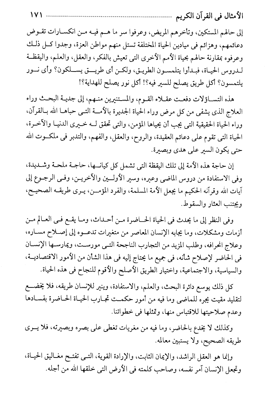 إن حاجة هذه الأمة إلى تلك اليقظة التى تشمل كل كيانها، حاجة ملحة وشديدة، وفى الاستفادة من دروس الماضى وعبره، وسير الأولين والآخرين، وفى الرجوع إلى آيات الله وقرآنه الحكيم ما يجعل الأمة المسلمة، والفرد المؤمن، يرى طريقه الصحيح، ويجتنب العثار والسقوط.