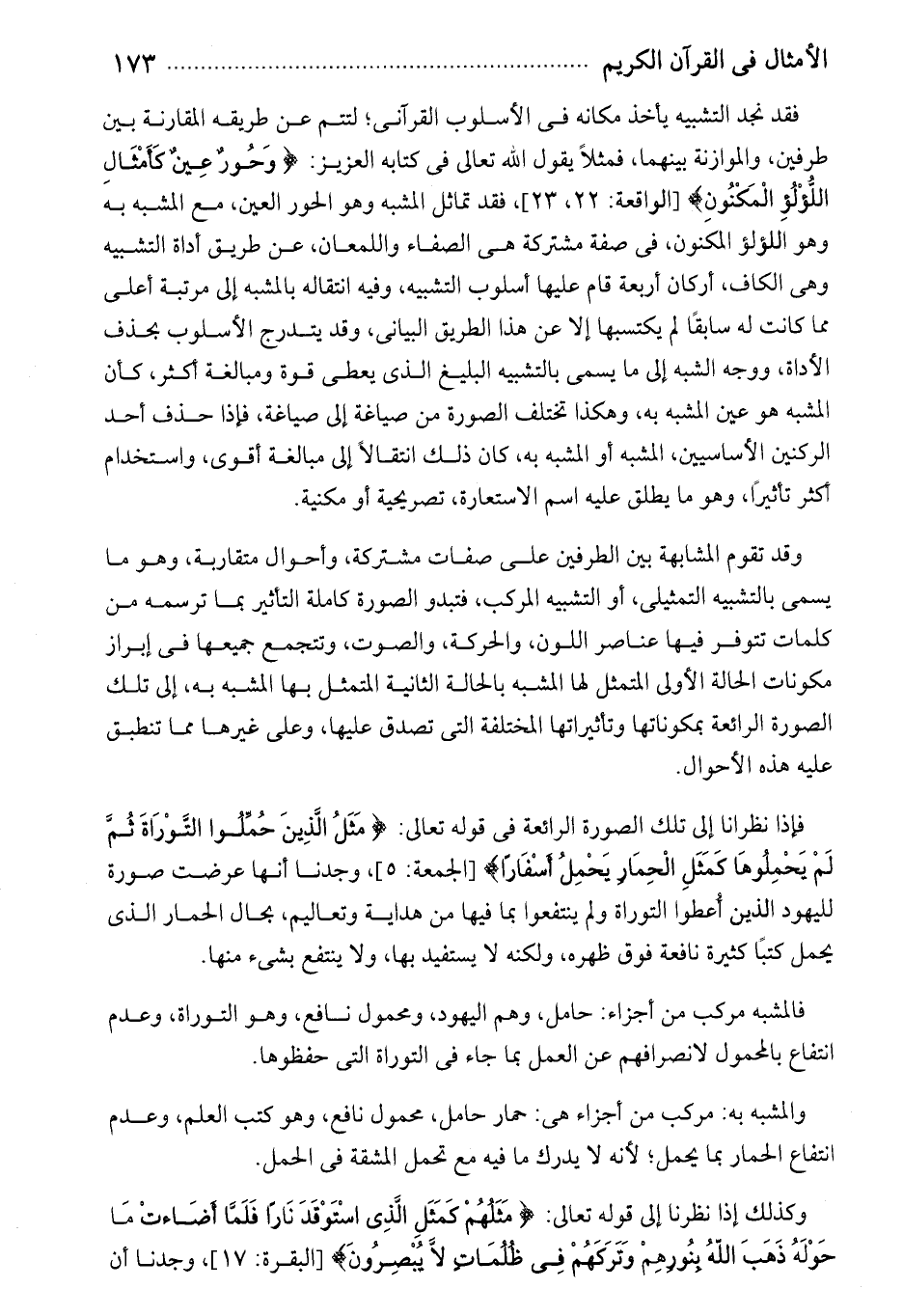 فقد نجد التشبيه يأخذ مكانه فى الأسلوب القرآنى؛ لتتم عن طريقه المقارنة بين طرفين، والموازنة بينهما، فمثلا يقول الله تعالى فى كتابه العزيز: وَحُورٌ عِينٌ كَأَمْثالِ اللُّؤْلُؤِ الْمَكْنُونِ [الواقعة: 22، 23]، فقد تماثل المشبه وهو الحور العين، مع المشبه به وهو اللؤلؤ المكنون، فى صفة مشتركة هى الصفاء واللمعان، عن طريق أداة التشبيه وهى الكاف، أركان أربعة قام عليها أسلوب التشبيه، وفيه انتقاله بالمشبه إلى مرتبة أعلى مما كانت له سابقا لم يكتسبها إلا عن هذا الطريق البيانى، وقد يتدرج الأسلوب بحذف الأداة، ووجه الشبه إلى ما يسمى بالتشبيه البليغ الذى يعطى قوة ومبالغة أكثر، كأن المشبه هو عين المشبه به، وهكذا تختلف الصورة من صياغة إلى صياغة، فإذا حذف أحد الركنين الأساسيين، المشبه أو المشبه به، كان ذلك انتقالا إلى مبالغة أقوى، واستخدام أكثر تأثيرا، وهو ما يطلق عليه اسم الاستعارة، تصريحية أو مكنية.