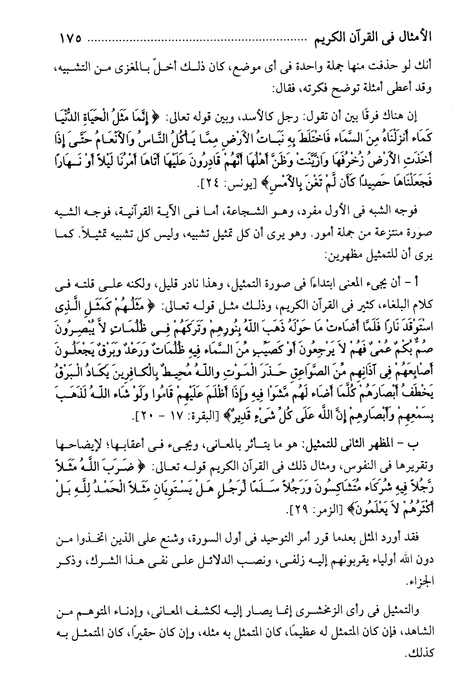 إن هناك فرقا بين أن تقول: رجل كالأسد، وبين قوله تعالى: إِنَّما مَثَلُ الْحَياةِ الدُّنْيا كَماءٍ أَنْزَلْناهُ مِنَ السَّماءِ فَاخْتَلَطَ بِهِ نَباتُ الْأَرْضِ مِمَّا يَأْكُلُ النَّاسُ وَالْأَنْعامُ حَتَّى إِذا أَخَذَتِ الْأَرْضُ زُخْرُفَها وَازَّيَّنَتْ وَظَنَّ أَهْلُها أَنَّهُمْ قادِرُونَ عَلَيْها أَتاها أَمْرُنا لَيْلًا أَوْ نَهاراً فَجَعَلْناها حَصِيداً كَأَنْ لَمْ تَغْنَ بِالْأَمْسِ [يونس: 24].