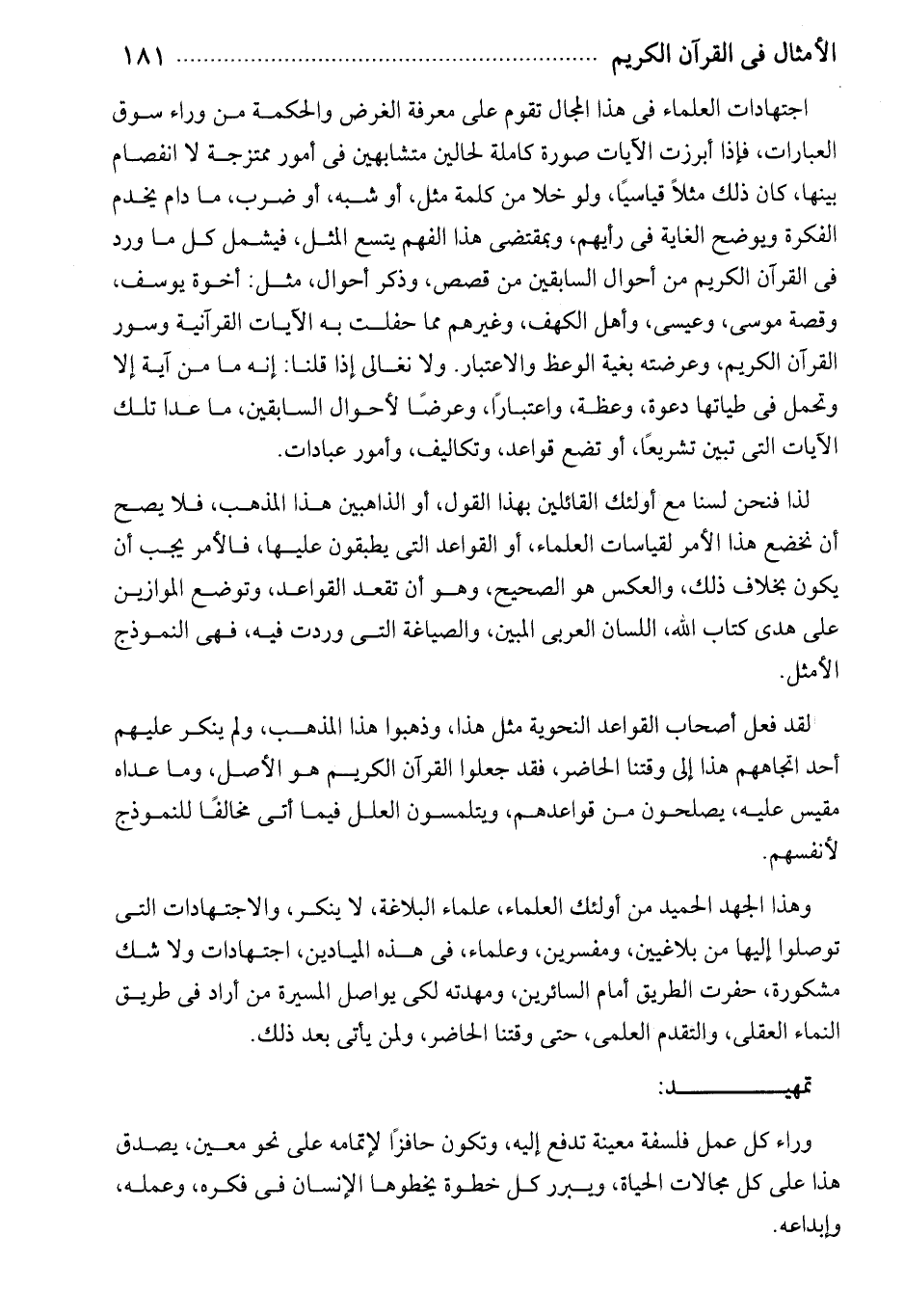 اجتهادات العلماء فى هذا المجال تقوم على معرفة الغرض والحكمة من وراء سوق العبارات، فإذا أبرزت الآيات صورة كاملة لحالين متشابهين فى أمور ممتزجة لا انفصام بينها، كان ذلك مثلا قياسيا، ولو خلا من كلمة مثل، أو شبه، أو ضرب، ما دام يخدم الفكرة ويوضح الغاية فى رأيهم، وبمقتضى هذا الفهم يتسع المثل، فيشمل كل ما ورد فى القرآن الكريم من أحوال السابقين من قصص، وذكر أحوال، مثل: أخوة يوسف، وقصة موسى، وعيسى، وأهل الكهف، وغيرهم مما حفلت به الآيات القرآنية وسور القرآن الكريم، وعرضته بغية الوعظ والاعتبار. ولا نغالى إذا قلنا: إنه ما من آية إلا وتحمل فى طياتها دعوة، وعظة، واعتبارا، وعرضا لأحوال السابقين، ما عدا تلك الآيات التى تبين تشريعا، أو تضع قواعد، وتكاليف، وأمور عبادات.