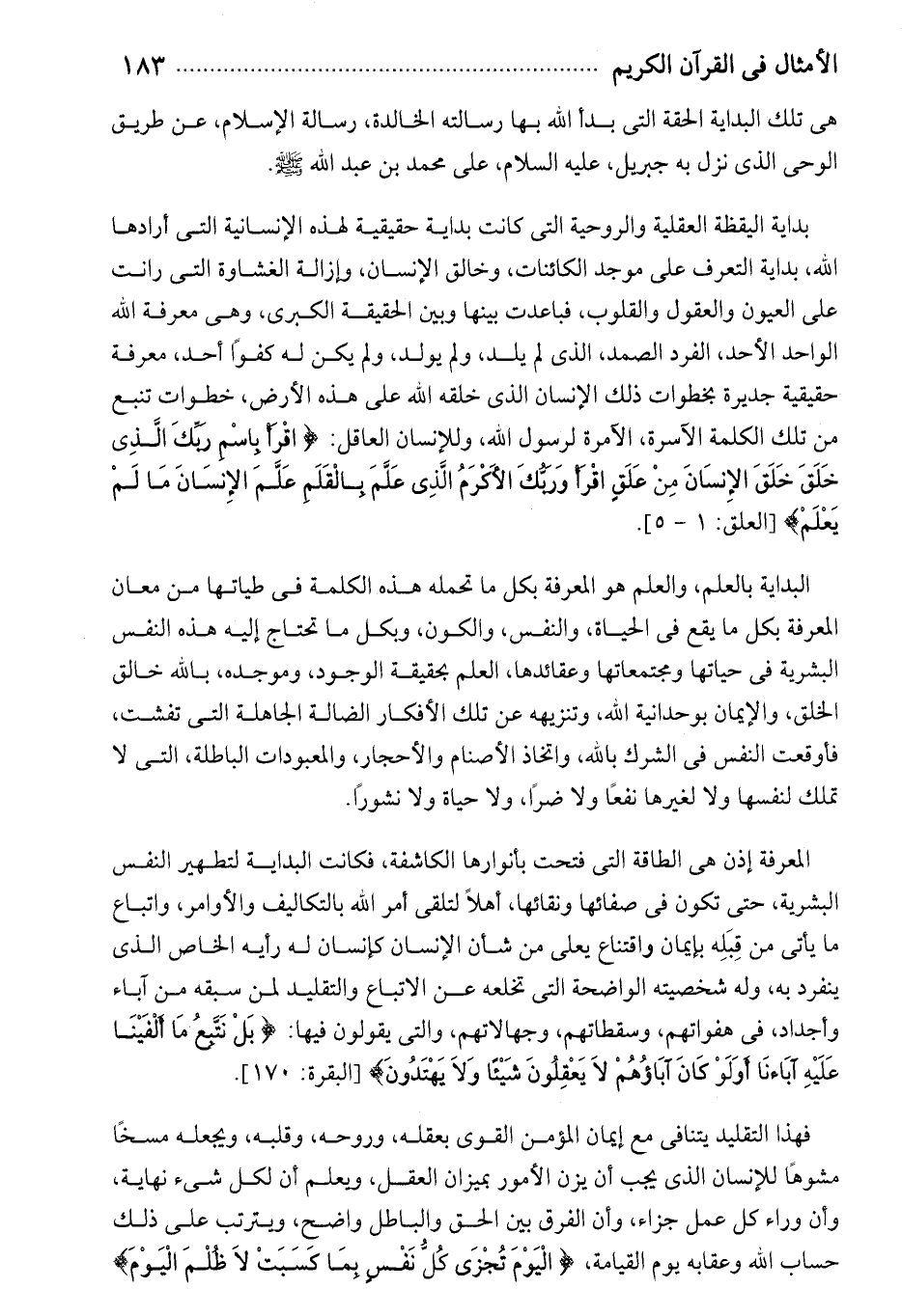 فهذا التقليد يتنافى مع إيمان المؤمن القوى بعقله، وروحه، وقلبه، ويجعله مسخا مشوها للإنسان الذى يجب أن يزن الأمور بميزان العقل، ويعلم أن لكل شىء نهاية، وأن وراء كل عمل جزاء، وأن الفرق بين الحق والباطل واضح، ويترتب على ذلك حساب الله وعقابه يوم القيامة، الْيَوْمَ تُجْزى كُلُّ نَفْسٍ بِما كَسَبَتْ لا ظُلْمَ الْيَوْمَ