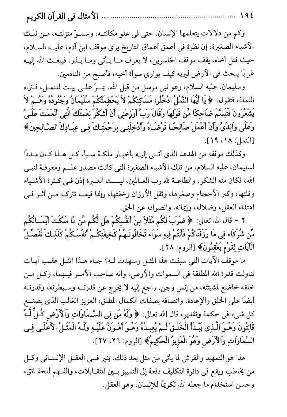 وسليمان، عليه السلام، وهو نبى مرسل من قبل الله، يمرّ على بيت للنمل، فتراه النملة، فتقول: يا أَيُّهَا النَّمْلُ ادْخُلُوا مَساكِنَكُمْ لا يَحْطِمَنَّكُمْ سُلَيْمانُ وَجُنُودُهُ وَهُمْ لا يَشْعُرُونَ فَتَبَسَّمَ ضاحِكاً مِنْ قَوْلِها وَقالَ رَبِّ أَوْزِعْنِي أَنْ أَشْكُرَ نِعْمَتَكَ الَّتِي أَنْعَمْتَ عَلَيَّ وَعَلى والِدَيَّ وَأَنْ أَعْمَلَ صالِحاً تَرْضاهُ وَأَدْخِلْنِي بِرَحْمَتِكَ فِي عِبادِكَ الصَّالِحِينَ [النمل: 18، 19].