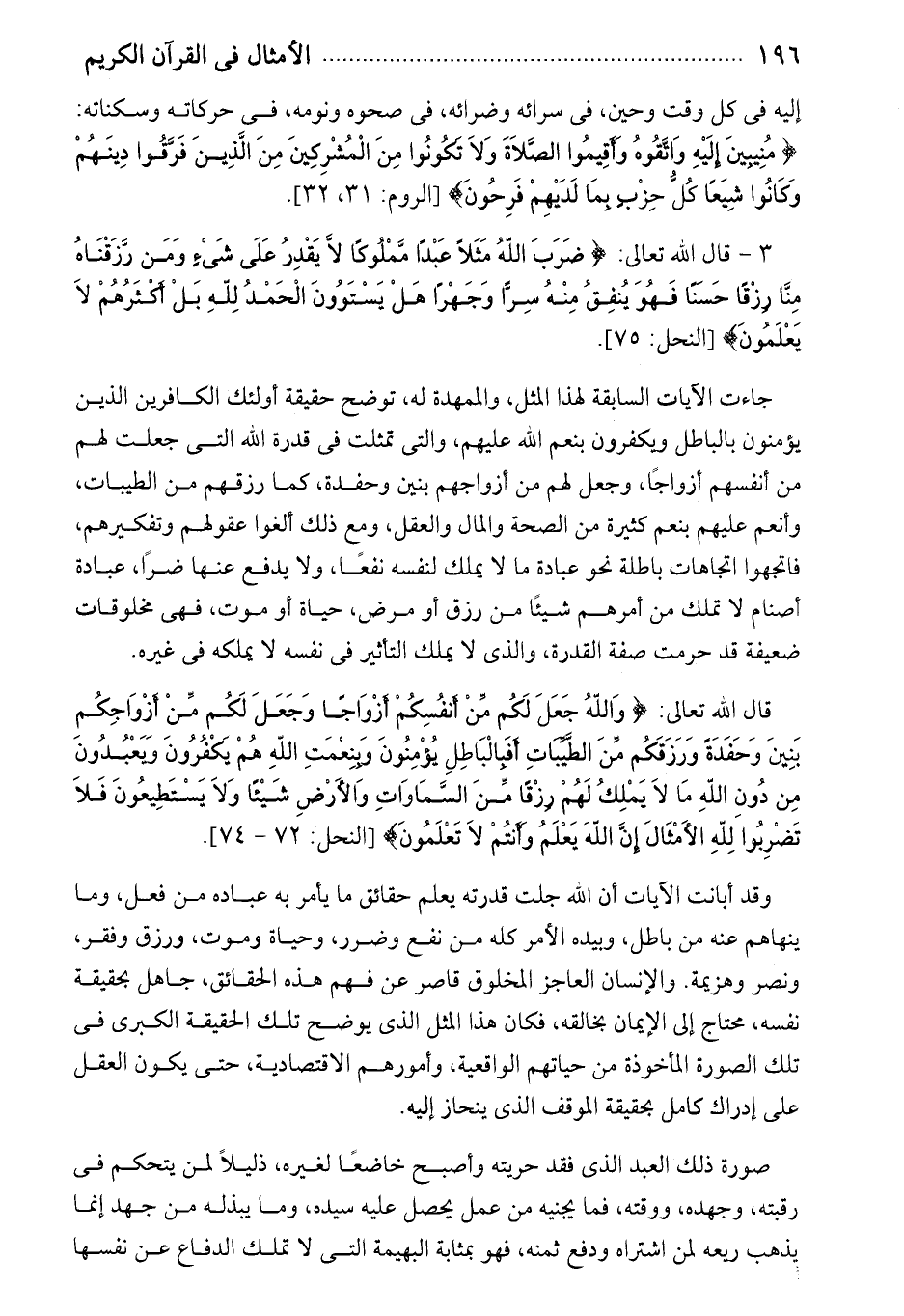 3 - قال الله تعالى: ضَرَبَ اللَّهُ مَثَلًا عَبْداً مَمْلُوكاً لا يَقْدِرُ عَلى شَيْءٍ وَمَنْ رَزَقْناهُ مِنَّا رِزْقاً حَسَناً فَهُوَ يُنْفِقُ مِنْهُ سِرًّا وَجَهْراً هَلْ يَسْتَوُونَ الْحَمْدُ لِلَّهِ بَلْ أَكْثَرُهُمْ لا يَعْلَمُونَ [النحل: 75].