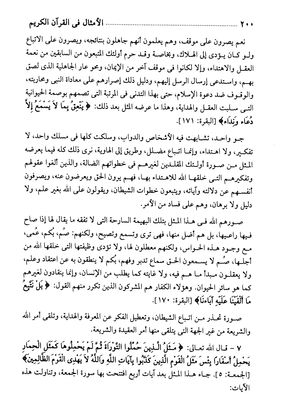 7 - قال الله تعالى: مَثَلُ الَّذِينَ حُمِّلُوا التَّوْراةَ ثُمَّ لَمْ يَحْمِلُوها كَمَثَلِ الْحِمارِ يَحْمِلُ أَسْفاراً بِئْسَ مَثَلُ الْقَوْمِ الَّذِينَ كَذَّبُوا بِآياتِ اللَّهِ وَاللَّهُ لا يَهْدِي الْقَوْمَ الظَّالِمِينَ [الجمعة: 5]. جاء هذا المثل بعد آيات أربع افتتحت بها سورة الجمعة، وتناولت هذه الآيات: