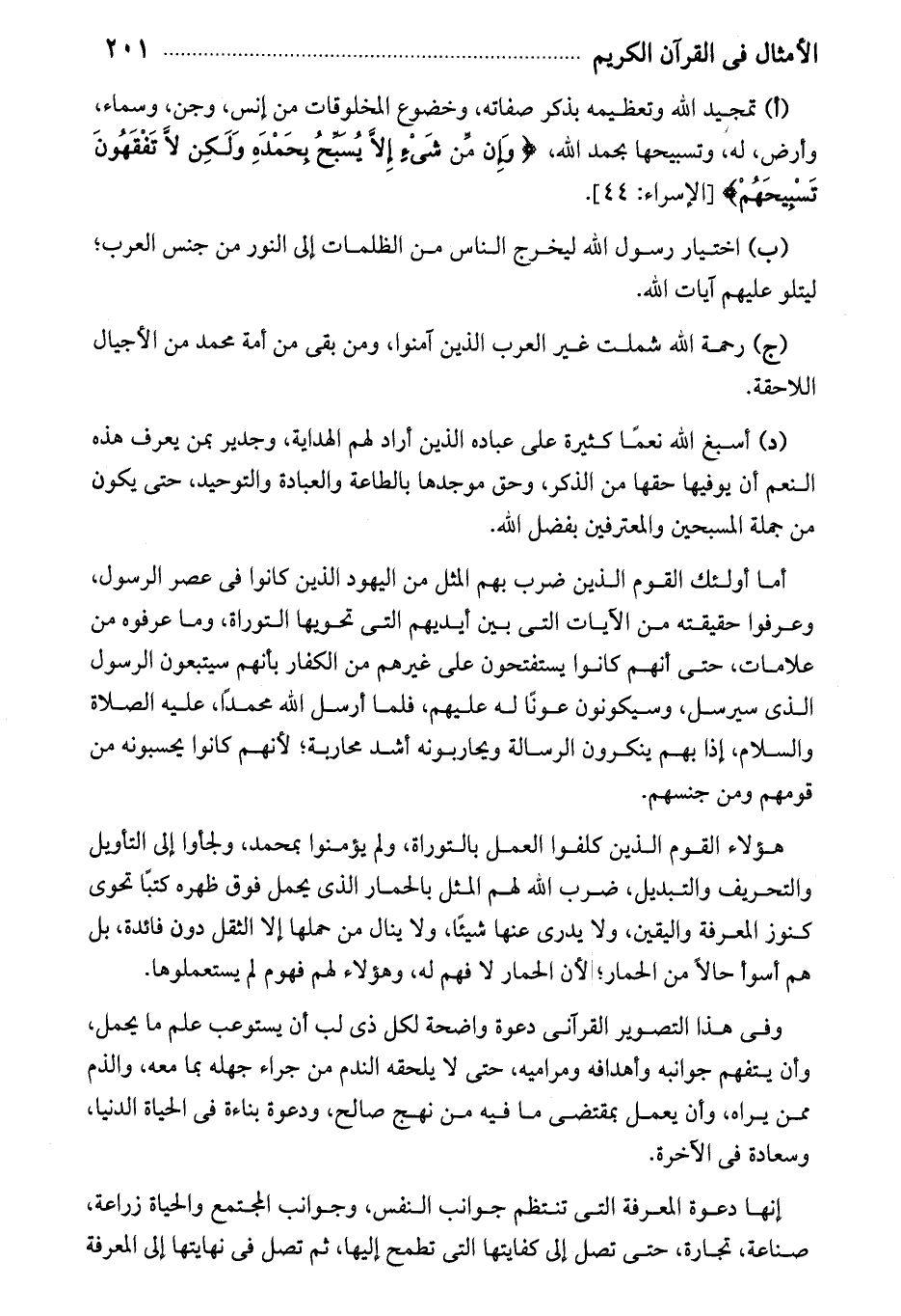 هؤلاء القوم الذين كلفوا العمل بالتوراة، ولم يؤمنوا بمحمد، ولجأوا إلى التأويل والتحريف والتبديل، ضرب الله لهم المثل بالحمار الذى يحمل فوق ظهره كتبا تحوى كنوز المعرفة واليقين، ولا يدرى عنها شيئا، ولا ينال من حملها إلا الثقل دون فائدة، بل هم أسوأ حالا من الحمار؛ لأن الحمار لا فهم له، وهؤلاء لهم فهوم لم يستعملوها.