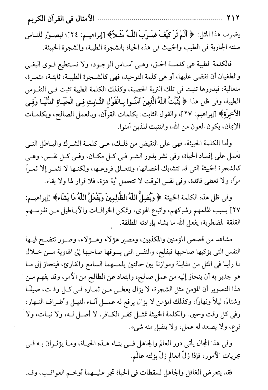 يضرب هذا المثل: أَلَمْ تَرَ كَيْفَ ضَرَبَ اللَّهُ مَثَلًا [إبراهيم: 24]؛ ليصوّر للناس سنته الجارية فى الطيب والخبيث فى هذه الحياة بالشجرة الطيبة، والشجرة الخبيثة.