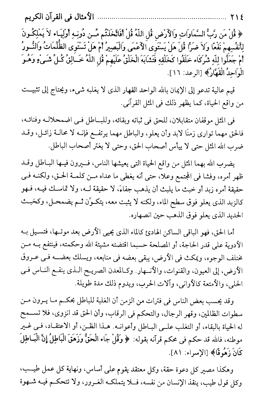أما الحق، فهو الباقى الساكن الهادئ كالماء الذى يحيى الأرض بعد موتها، فتسيل به الأدوية على قدر الحاجة، أو المصلحة حسبما اقتضته مشيئة الله وحكمته، فينتفع به من مختلف الوجوه، ويمكث فى الأرض، يبقى بعضه فى منابعه، ويسلك بعضه فى عروق الأرض، إلى العيون، والقنوات، والأنهار. وكالمعدن الصريح الذى ينفع الناس فى الحلى، والأمتعة كالأوانى، وآلات الحرب، ويدوم ذلك مدة طويلة.
