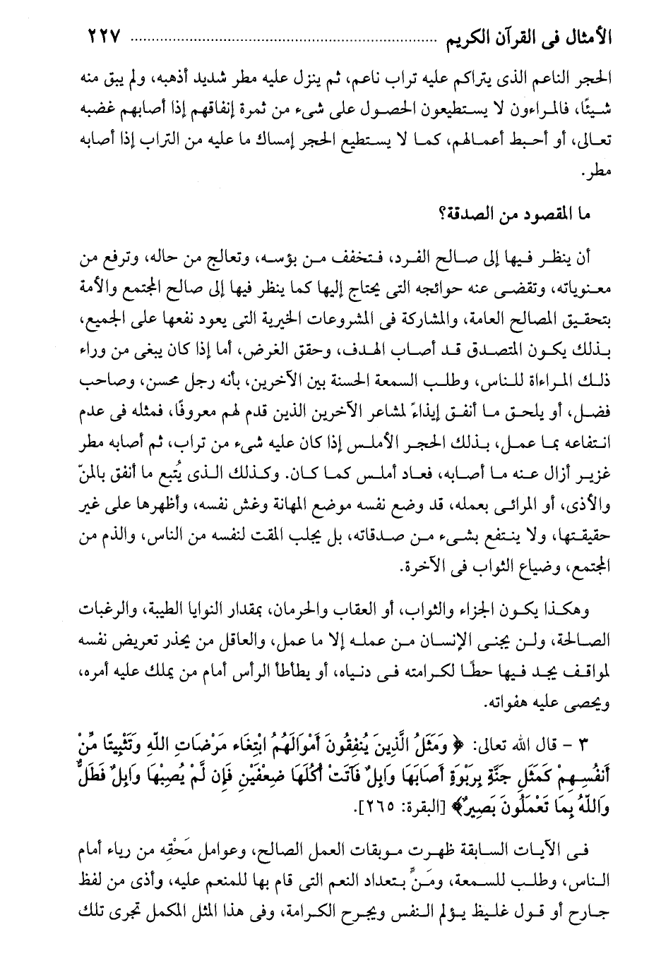 أن ينظر فيها إلى صالح الفرد، فتخفف من بؤسه، وتعالج من حاله، وترفع من معنوياته، وتقضى عنه حوائجه التى يحتاج إليها كما ينظر فيها إلى صالح المجتمع والأمة بتحقيق المصالح العامة، والمشاركة فى المشروعات الخيرية التى يعود نفعها على الجميع، بذلك يكون المتصدق قد أصاب الهدف، وحقق الغرض، أما إذا كان يبغى من وراء ذلك المراءاة للناس، وطلب السمعة الحسنة بين الآخرين، بأنه رجل محسن، وصاحب فضل، أو يلحق ما أنفق إيذاء لمشاعر الآخرين الذين قدم لهم معروفا، فمثله فى عدم انتفاعه بما عمل، بذلك الحجر الأملس إذا كان عليه شىء من تراب، ثم أصابه مطر غزير أزال عنه ما أصابه، فعاد أملس كما كان. وكذلك الذى يتبع ما أنفق بالمنّ والأذى، أو المرائى بعمله، قد وضع نفسه موضع المهانة وغش نفسه، وأظهرها على غير حقيقتها، ولا ينتفع بشيء من صدقاته، بل يجلب المقت لنفسه من الناس، والذم من المجتمع، وضياع الثواب فى الآخرة.