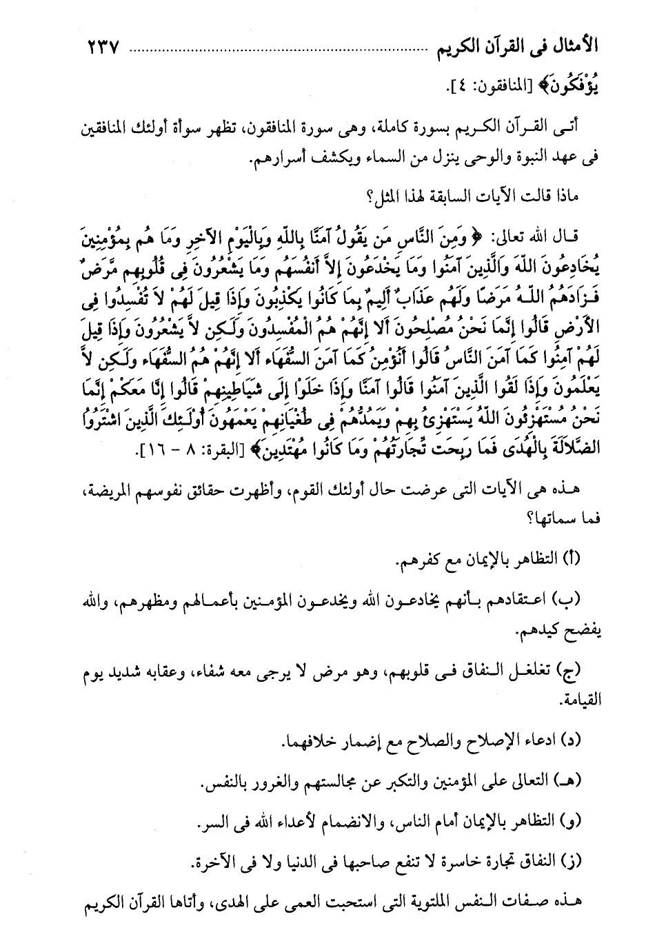 قال الله تعالى: وَمِنَ النَّاسِ مَنْ يَقُولُ آمَنَّا بِاللَّهِ وَبِالْيَوْمِ الْآخِرِ وَما هُمْ بِمُؤْمِنِينَ يُخادِعُونَ اللَّهَ وَالَّذِينَ آمَنُوا وَما يَخْدَعُونَ إِلَّا أَنْفُسَهُمْ وَما يَشْعُرُونَ فِي قُلُوبِهِمْ مَرَضٌ فَزادَهُمُ اللَّهُ مَرَضاً وَلَهُمْ عَذابٌ أَلِيمٌ بِما كانُوا يَكْذِبُونَ وَإِذا قِيلَ لَهُمْ لا تُفْسِدُوا فِي الْأَرْضِ قالُوا إِنَّما نَحْنُ مُصْلِحُونَ أَلا إِنَّهُمْ هُمُ الْمُفْسِدُونَ وَلكِنْ لا يَشْعُرُونَ وَإِذا قِيلَ لَهُمْ آمِنُوا كَما آمَنَ النَّاسُ قالُوا أَنُؤْمِنُ كَما آمَنَ السُّفَهاءُ أَلا إِنَّهُمْ هُمُ السُّفَهاءُ وَلكِنْ لا يَعْلَمُونَ وَإِذا لَقُوا الَّذِينَ آمَنُوا قالُوا آمَنَّا وَإِذا خَلَوْا إِلى شَياطِينِهِمْ قالُوا إِنَّا مَعَكُمْ إِنَّما نَحْنُ مُسْتَهْزِؤُنَ اللَّهُ يَسْتَهْزِئُ بِهِمْ وَيَمُدُّهُمْ فِي طُغْيانِهِمْ يَعْمَهُونَ أُولئِكَ الَّذِينَ اشْتَرَوُا الضَّلالَةَ بِالْهُدى فَما رَبِحَتْ تِجارَتُهُمْ وَما كانُوا مُهْتَدِينَ [البقرة: 8 - 16].