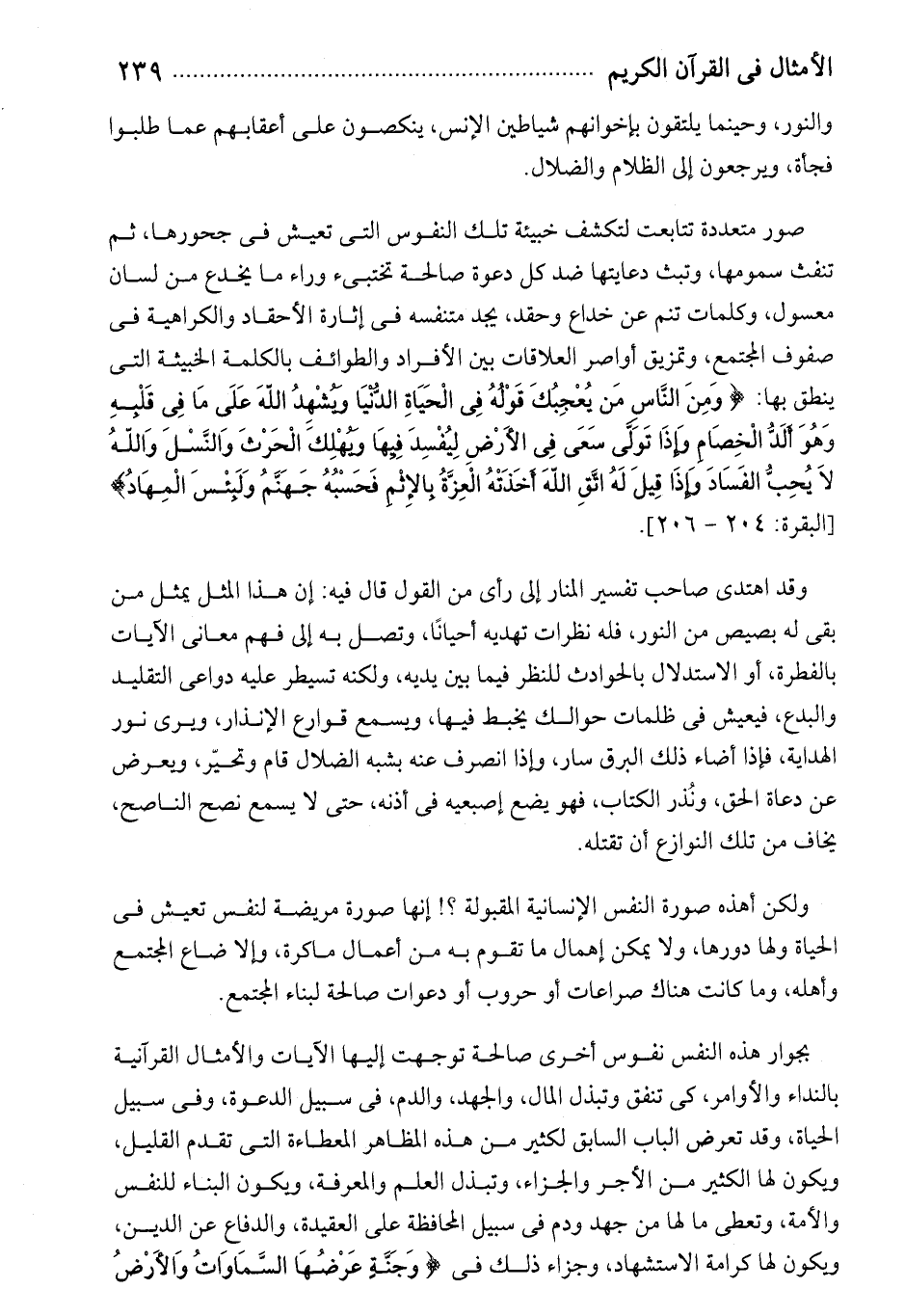 صور متعددة تتابعت لتكشف خبيئة تلك النفوس التى تعيش فى جحورها، ثم تنفث سمومها، وتبث دعايتها ضد كل دعوة صالحة تختبئ وراء ما يخدع من لسان معسول، وكلمات تنم عن خداع وحقد، يجد متنفسه فى إثارة الأحقاد والكراهية فى صفوف المجتمع، وتمزيق أواصر العلاقات بين الأفراد والطوائف بالكلمة الخبيثة التى ينطق بها: وَمِنَ النَّاسِ مَنْ يُعْجِبُكَ قَوْلُهُ فِي الْحَياةِ الدُّنْيا وَيُشْهِدُ اللَّهَ عَلى ما فِي قَلْبِهِ وَهُوَ أَلَدُّ الْخِصامِ وَإِذا تَوَلَّى سَعى فِي الْأَرْضِ لِيُفْسِدَ فِيها وَيُهْلِكَ الْحَرْثَ وَالنَّسْلَ وَاللَّهُ لا يُحِبُّ الْفَسادَ وَإِذا قِيلَ لَهُ اتَّقِ اللَّهَ أَخَذَتْهُ الْعِزَّةُ بِالْإِثْمِ فَحَسْبُهُ جَهَنَّمُ وَلَبِئْسَ الْمِهادُ [البقرة: 204 - 206].