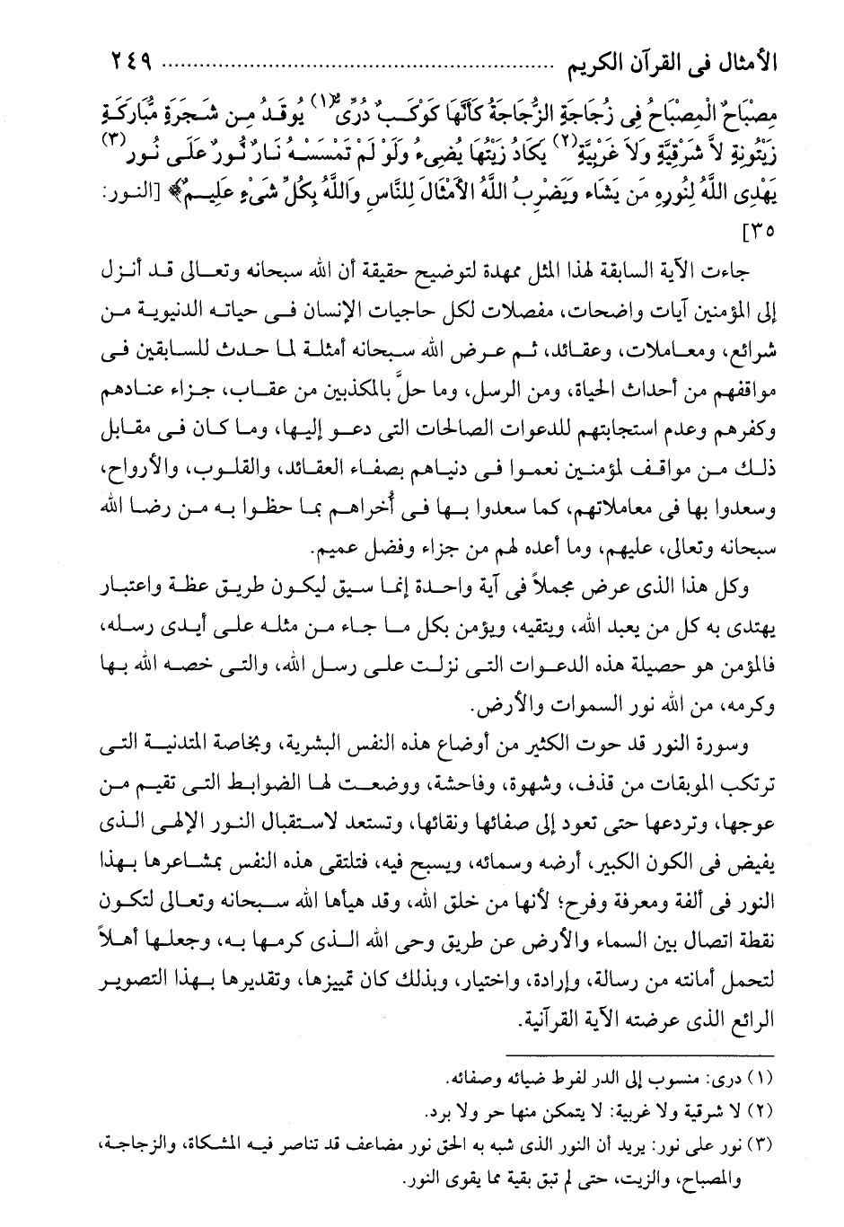 مِصْباحٌ الْمِصْباحُ فِي زُجاجَةٍ الزُّجاجَةُ كَأَنَّها كَوْكَبٌ دُرِّيٌّ (¬1) يُوقَدُ مِنْ شَجَرَةٍ مُبارَكَةٍ زَيْتُونَةٍ لا شَرْقِيَّةٍ وَلا غَرْبِيَّةٍ (¬2) يَكادُ زَيْتُها يُضِيءُ وَلَوْ لَمْ تَمْسَسْهُ نارٌ نُورٌ عَلى نُورٍ (¬3) يَهْدِي اللَّهُ لِنُورِهِ مَنْ يَشاءُ وَيَضْرِبُ اللَّهُ الْأَمْثالَ لِلنَّاسِ وَاللَّهُ بِكُلِّ شَيْءٍ عَلِيمٌ [النور: