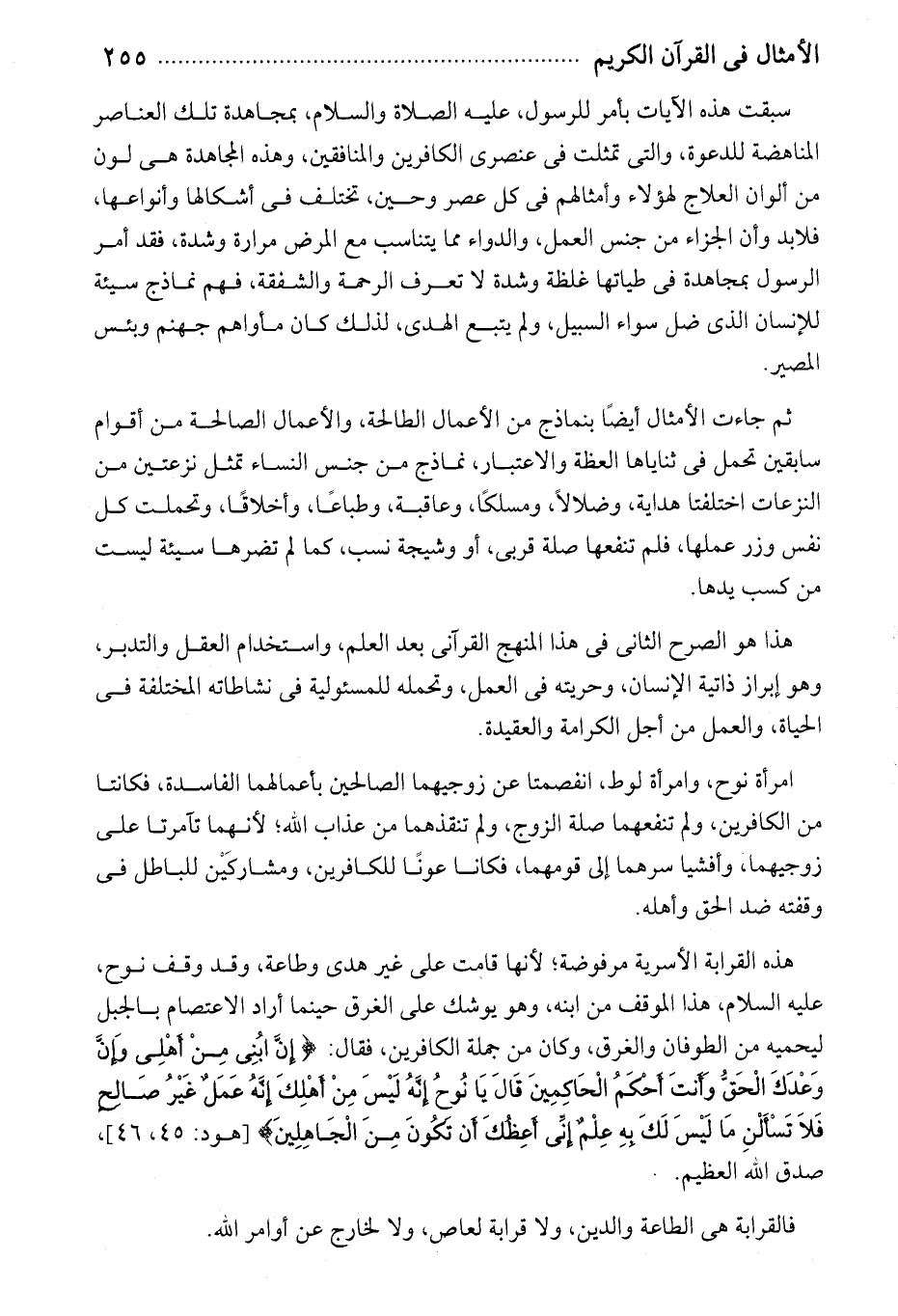 ثم جاءت الأمثال أيضا بنماذج من الأعمال الطالحة، والأعمال الصالحة من أقوام سابقين تحمل فى ثناياها العظة والاعتبار، نماذج من جنس النساء تمثل نزعتين من النزعات اختلفتا هداية، وضلالا، ومسلكا، وعاقبة، وطباعا، وأخلاقا، وتحملت كل نفس وزر عملها، فلم تنفعها صلة قربى، أو وشيجة نسب، كما لم تضرها سيئة ليست من كسب يدها.
