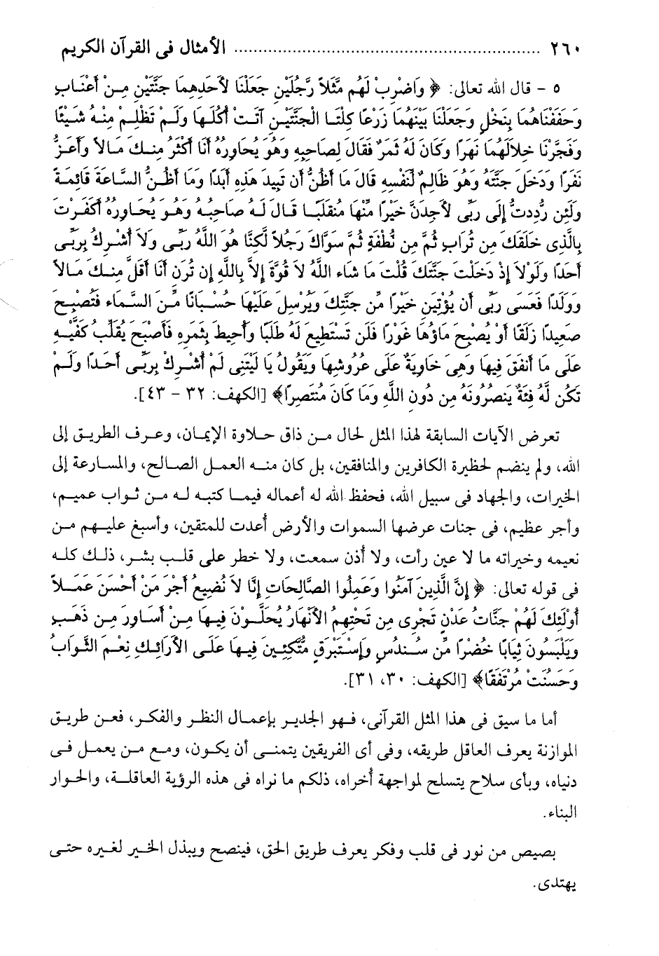 5 - قال الله تعالى: وَاضْرِبْ لَهُمْ مَثَلًا رَجُلَيْنِ جَعَلْنا لِأَحَدِهِما جَنَّتَيْنِ مِنْ أَعْنابٍ وَحَفَفْناهُما بِنَخْلٍ وَجَعَلْنا بَيْنَهُما زَرْعاً كِلْتَا الْجَنَّتَيْنِ آتَتْ أُكُلَها وَلَمْ تَظْلِمْ مِنْهُ شَيْئاً وَفَجَّرْنا خِلالَهُما نَهَراً وَكانَ لَهُ ثَمَرٌ فَقالَ لِصاحِبِهِ وَهُوَ يُحاوِرُهُ أَنَا أَكْثَرُ مِنْكَ مالًا وَأَعَزُّ نَفَراً وَدَخَلَ جَنَّتَهُ وَهُوَ ظالِمٌ لِنَفْسِهِ قالَ ما أَظُنُّ أَنْ تَبِيدَ هذِهِ أَبَداً وَما أَظُنُّ السَّاعَةَ قائِمَةً وَلَئِنْ رُدِدْتُ إِلى رَبِّي لَأَجِدَنَّ خَيْراً مِنْها مُنْقَلَباً قالَ لَهُ صاحِبُهُ وَهُوَ يُحاوِرُهُ أَكَفَرْتَ بِالَّذِي خَلَقَكَ مِنْ تُرابٍ ثُمَّ مِنْ نُطْفَةٍ ثُمَّ سَوَّاكَ رَجُلًا لكِنَّا هُوَ اللَّهُ رَبِّي وَلا أُشْرِكُ بِرَبِّي أَحَداً وَلَوْلا إِذْ دَخَلْتَ جَنَّتَكَ قُلْتَ ما شاءَ اللَّهُ لا قُوَّةَ إِلَّا بِاللَّهِ إِنْ تَرَنِ أَنَا أَقَلَّ مِنْكَ مالًا وَوَلَداً فَعَسى رَبِّي أَنْ يُؤْتِيَنِ خَيْراً مِنْ جَنَّتِكَ وَيُرْسِلَ عَلَيْها حُسْباناً مِنَ السَّماءِ فَتُصْبِحَ صَعِيداً زَلَقاً أَوْ يُصْبِحَ ماؤُها غَوْراً فَلَنْ تَسْتَطِيعَ لَهُ طَلَباً وَأُحِيطَ بِثَمَرِهِ فَأَصْبَحَ يُقَلِّبُ كَفَّيْهِ عَلى ما أَنْفَقَ فِيها وَهِيَ خاوِيَةٌ عَلى عُرُوشِها وَيَقُولُ يا لَيْتَنِي لَمْ أُشْرِكْ بِرَبِّي أَحَداً وَلَمْ تَكُنْ لَهُ فِئَةٌ يَنْصُرُونَهُ مِنْ دُونِ اللَّهِ وَما كانَ مُنْتَصِراً [2 لكهف: 32 - 43].