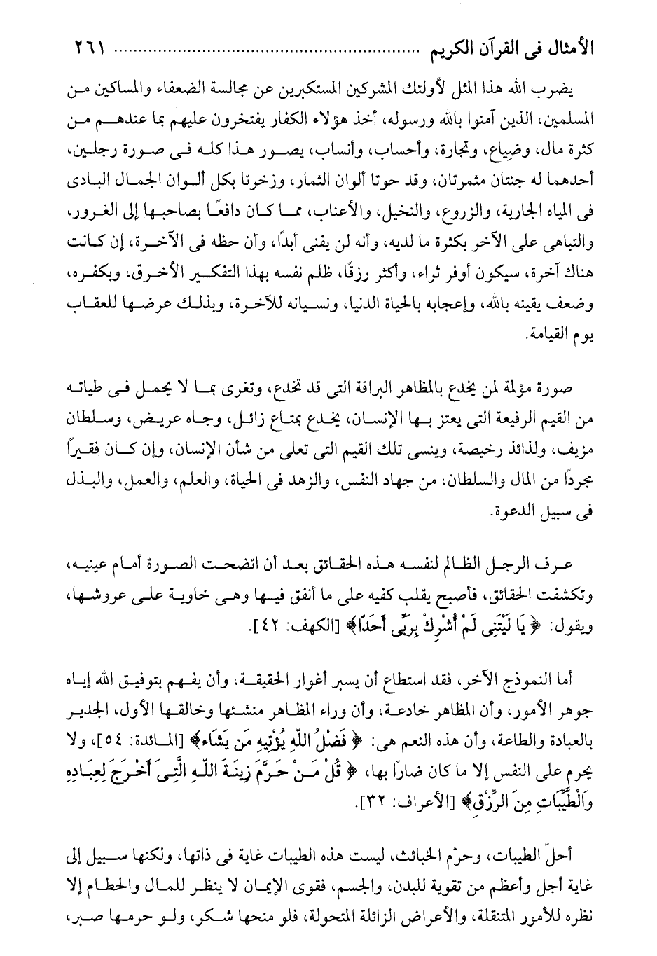 يضرب الله هذا المثل لأولئك المشركين المستكبرين عن مجالسة الضعفاء والمساكين من المسلمين، الذين آمنوا بالله ورسوله، أخذ هؤلاء الكفار يفتخرون عليهم بما عندهم من كثرة مال، وضياع، وتجارة، وأحساب، وأنساب، يصور هذا كله فى صورة رجلين، أحدهما له جنتان مثمرتان، وقد حوتا ألوان الثمار، وزخرتا بكل ألوان الجمال البادى فى المياه الجارية، والزروع، والنخيل، والأعناب، مما كان دافعا بصاحبها إلى الغرور، والتباهى على الآخر بكثرة ما لديه، وأنه لن يفنى أبدا، وأن حظه فى الآخرة، إن كانت هناك آخرة، سيكون أوفر ثراء، وأكثر رزقا، ظلم نفسه بهذا التفكير الأخرق، وبكفره، وضعف يقينه بالله، وإعجابه بالحياة الدنيا، ونسيانه للآخرة، وبذلك عرضها للعقاب يوم القيامة.