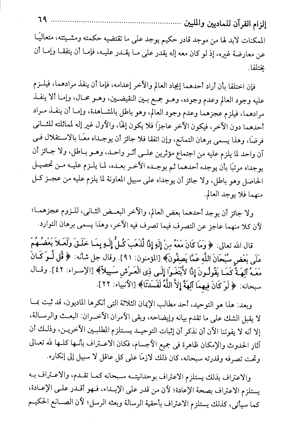 قال الله تعالى: وَما كانَ مَعَهُ مِنْ إِلهٍ إِذاً لَذَهَبَ كُلُّ إِلهٍ بِما خَلَقَ وَلَعَلا بَعْضُهُمْ عَلى بَعْضٍ سُبْحانَ اللَّهِ عَمَّا يَصِفُونَ [المؤمنون: 91]. وقال جل شأنه: قُلْ لَوْ كانَ مَعَهُ آلِهَةٌ كَما يَقُولُونَ إِذاً لَابْتَغَوْا إِلى ذِي الْعَرْشِ سَبِيلًا [الإسراء: 42]. وقال سبحانه: لَوْ كانَ فِيهِما آلِهَةٌ إِلَّا اللَّهُ لَفَسَدَتا [الأنبياء: 22].