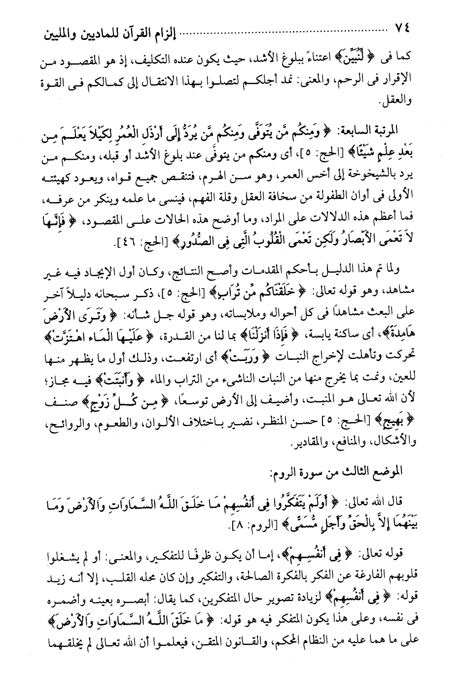 المرتبة السابعة: وَمِنْكُمْ مَنْ يُتَوَفَّى وَمِنْكُمْ مَنْ يُرَدُّ إِلى أَرْذَلِ الْعُمُرِ لِكَيْلا يَعْلَمَ مِنْ بَعْدِ عِلْمٍ شَيْئاً [الحج: 5]، أى ومنكم من يتوفّى عند بلوغ الأشد أو قبله، ومنكم من يرد بالشيخوخة إلى أخس العمر، وهو سن الهرم، فتنقص جميع قواه، ويعود كهيئته الأولى فى أوان الطفولة من سخافة العقل وقلة الفهم، فينسى ما علمه وينكر من عرفه، فما أعظم هذه الدلالات على المراد، وما أوضح هذه الحالات على المقصود، فَإِنَّها لا تَعْمَى الْأَبْصارُ وَلكِنْ تَعْمَى الْقُلُوبُ الَّتِي فِي الصُّدُورِ [الحج: 46].