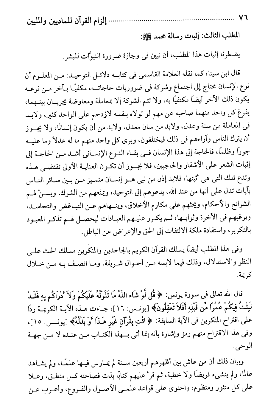قال ابن سينا، كما نقله العلامة القاسمى فى كتابه دلائل التوحيد: من المعلوم أن نوع الإنسان محتاج إلى اجتماع وشركة فى ضروريات حاجاته، مكفيا بآخر من نوعه يكون ذلك الآخر أيضا مكتفيا به، ولا تتم الشركة إلا بمعاملة ومعاوضة يجريان بينهما، يفرغ كل واحد منهما صاحبه عن مهم لو تولاه بنفسه لازدحم على الواحد كثير، ولا بد فى المعاملة من سنة وعدل، ولا بدّ من سان معدل، ولا بدّ من أن يكون إنسانا، ولا يجوز أن يترك الناس وآراءهم فى ذلك فيختلفون، ويرى كل واحد منهم ما له عدلا وما عليه جورا وظلما، فالحاجة إلى هذا الإنسان فى بقاء النوع الإنسانى أشد من الحاجة إلى إثبات الشعر على الأشفار والحاجبين، فلا يجوز أن تكون العناية الأولى تقتضى هذه وتدع تلك التى هى أثبتها، فلا بد إذن من نبى هو إنسان متميز من بين سائر الناس بآيات تدل على أنها من عند الله، يدعوهم إلى التوحيد، ويمنعهم من الشرك، ويسنّ لهم الشرائع والأحكام، ويحثهم على مكارم الأخلاق، وينهاهم عن التباغض والتحاسد، ويرغبهم فى الآخرة وثوابها، ثم يكرر عليهم العبادات ليحصل لهم تذكر المعبود بالتكرير، واستفادة ملكة الالتفات إلى الحق والإعراض عن الباطل.