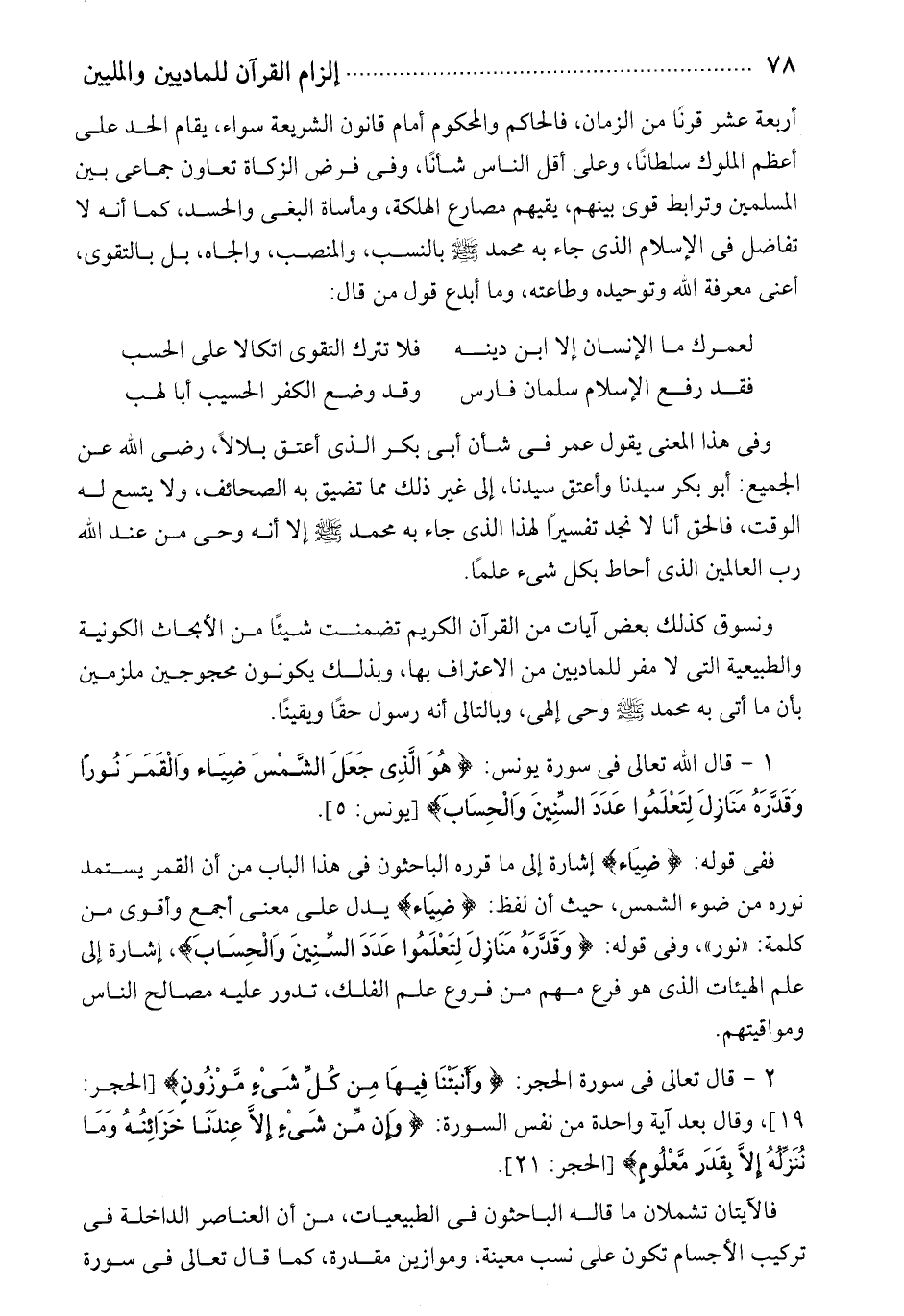 ونسوق كذلك بعض آيات من القرآن الكريم تضمنت شيئا من الأبحاث الكونية والطبيعية التى لا مفر للماديين من الاعتراف بها، وبذلك يكونون محجوجين ملزمين بأن ما أتى به محمد صلى الله عليه وسلم وحى إلهى، وبالتالى أنه رسول حقا ويقينا.