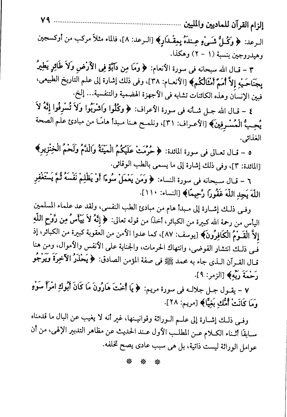 5 - قال تعالى فى سورة المائدة: حُرِّمَتْ عَلَيْكُمُ الْمَيْتَةُ وَالدَّمُ وَلَحْمُ الْخِنْزِيرِ [المائدة: 3]، وفى ذلك إشارة إلى ما يسمى بالطب الوقائى.