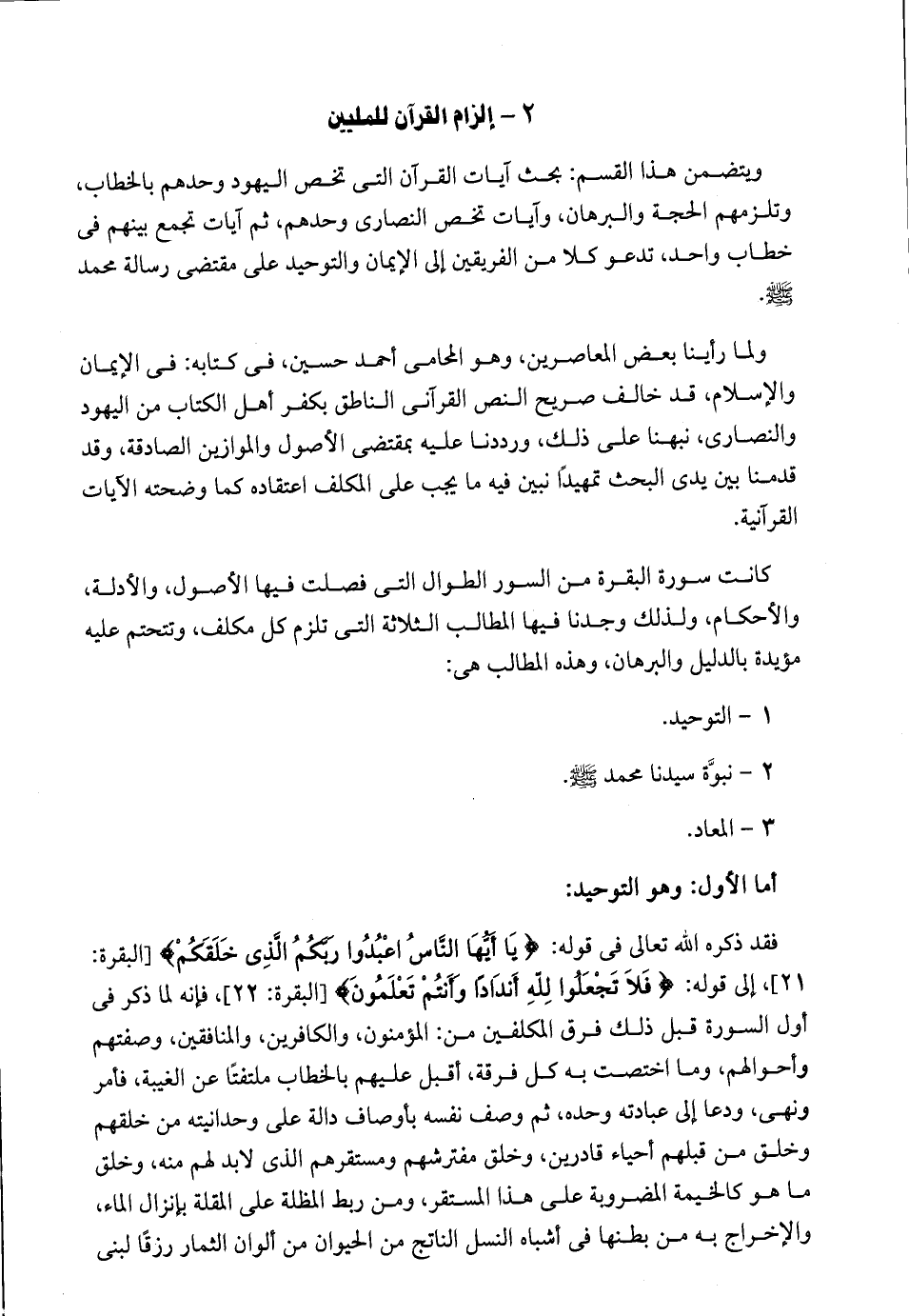 ولما رأينا بعض المعاصرين، وهو المحامى أحمد حسين، فى كتابه: فى الإيمان والإسلام، قد خالف صريح النص القرآنى الناطق بكفر أهل الكتاب من اليهود والنصارى، نبهنا على ذلك، ورددنا عليه بمقتضى الأصول والموازين الصادقة، وقد قدمنا بين يدى البحث تمهيدا نبين فيه ما يجب على المكلف اعتقاده كما وضحته الآيات القرآنية.